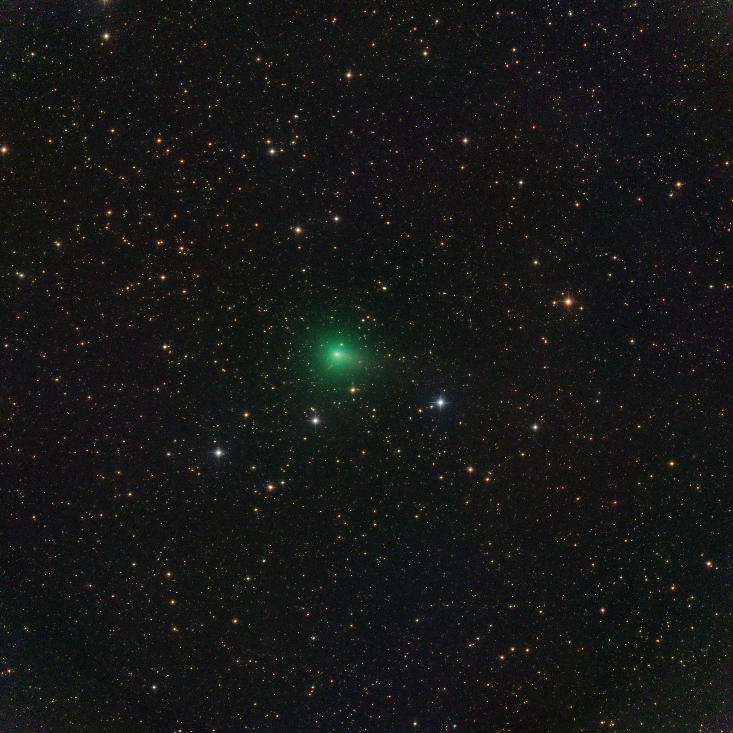 Comet C/2020 R4 (ATLAS) on March 27, 2021, my first image of this comet after eleven failed attempts due to the storms hit Australia in March. Currently at magnitude 9 it could reach magnitude 8 by the end of April. The image shows a gasy coma of 6 arcminutes in angular size (275,000 km) with an intense green color indicating a C2 strong emission, with a sharp central condensation and an ionic tail of 5 arcminutes. The field is about 1 square degree centered in the south of the constellation Aquila.