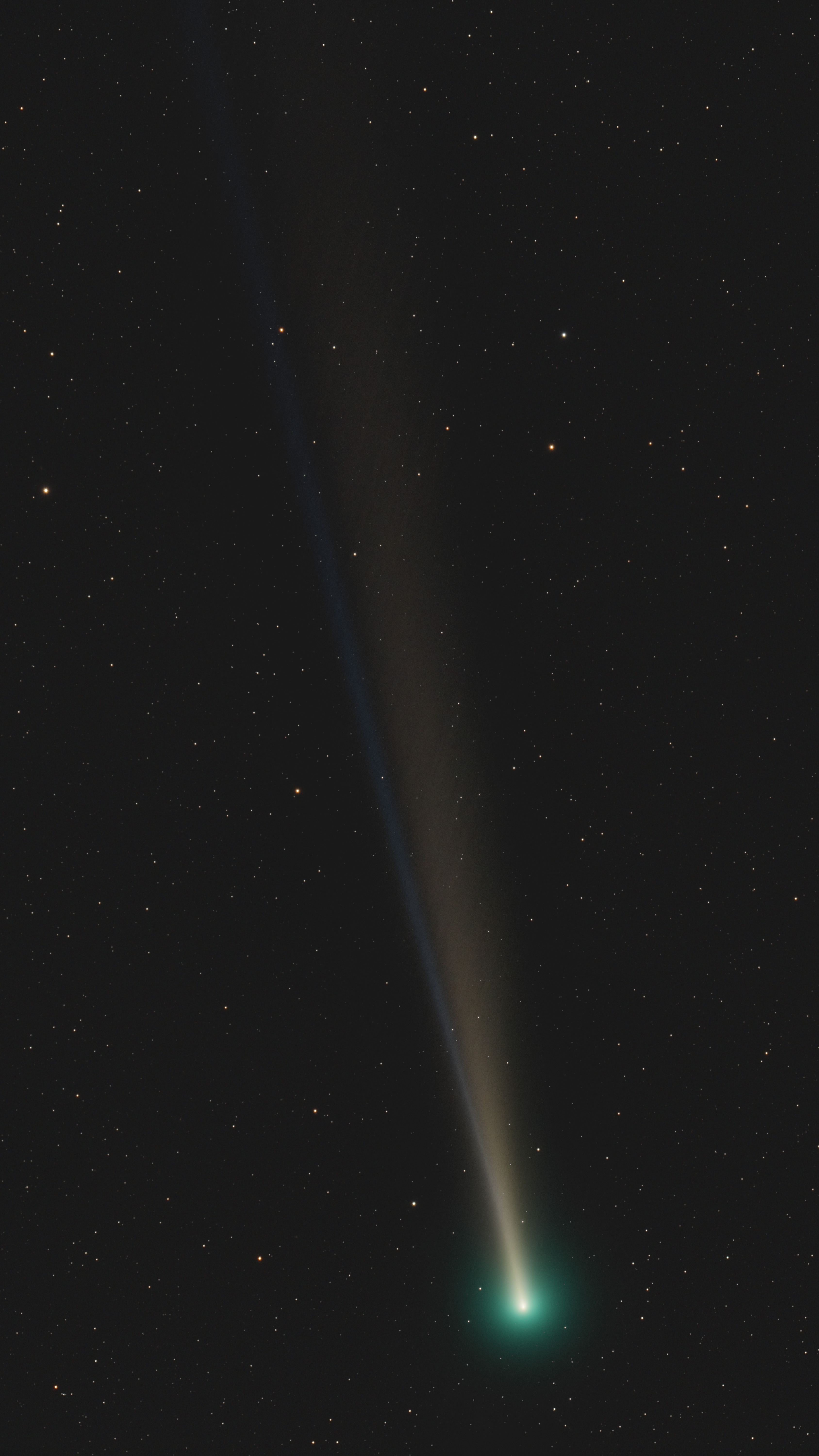 Anbei meine Aufnahme des Kometen Leonard vom 10. Dezember 2021, zwischen 5:00 und 6:15 Uhr. Aufgrund der sich nunmehr ändernden Perspektive - die Kometenbahn krümmt sich zunehmend am Weg um die Sonne - trat am 10. Dezember erstmalig der Ionenschweif aus dem Staubschweif hervor. In der horizontnahen Lichtverschmutzung ist vermutlich die bläuliche Färbung dieses Schweifs untergegangen, so dass ich diesen künstlich eingefärbt habe.