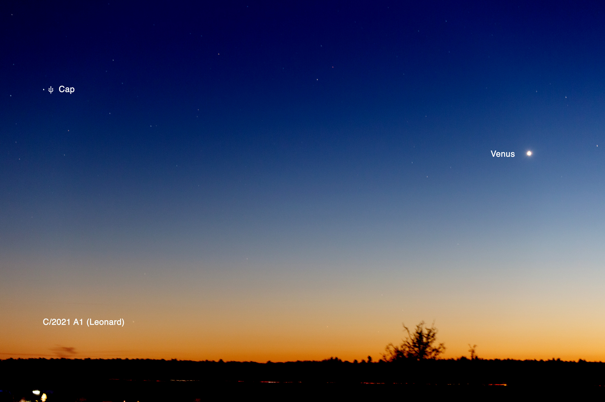 Der Komet C/2021 A1 (Leonard) hat sich leider nun auf den Südsternhimmel zurück gezogen. Am Abend des 20. Dezember 2021 konnten wir ihn noch in der Dämmerung sehr knapp über dem Horizont, tief im Südwesten ablichten. Ein sehr klarer Himmel half dazu. Venus als strahlender "Leitstern" half, um den richtigen Ort und Ausschnitt für ein Bild am Himmel zu bestimmen. Ein Schweifansatz am Kometen ist gerade so zu erkennen.