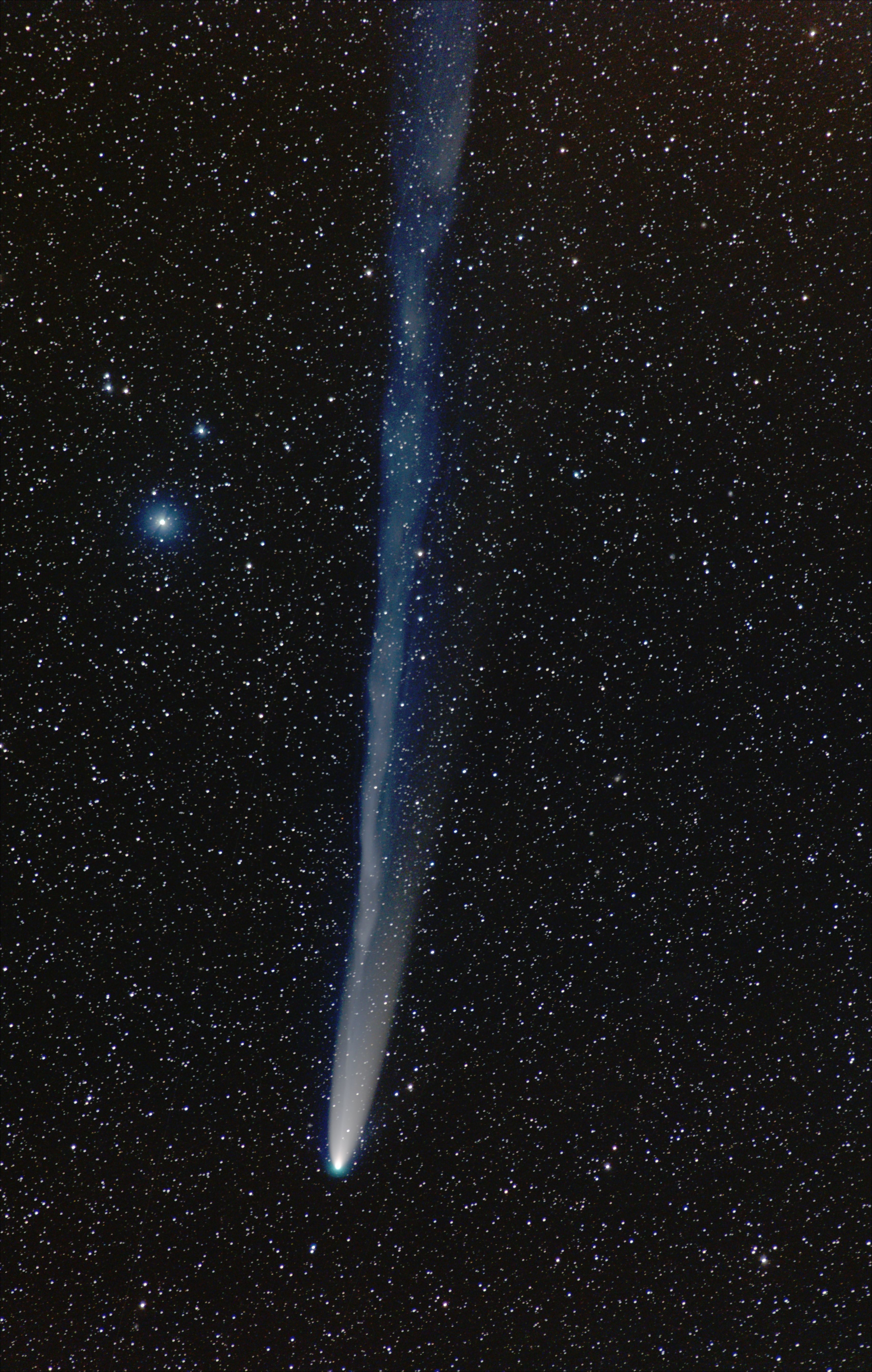 Am 3. Januar durchlief der Komet Leonard sein Perihel und entfernt sich seitdem auch von der Sonne. Seine größte Annäherung an die Erde war am 12. Dezember. Seit den letzten zwei Wochen ist der Komet bereits deutlich lichtschwächer geworden und ließ sich nun mit bloßem Auge gerade noch erkennen. Diese Aufnahme am Tag seines Periheldurchgangs gelang auf einer Passanhöhe im so genannten Kleinen Norden Chiles, einer sehr dünn besiedelten, halbwüstenartigen Region, etwa vier Autostunden von Santiago entfernt. Am Horizont waren nur wenige schwache Aufhellungen auszumachen, und in Richtung des Kometen war der Himmel optimal dunkel.
