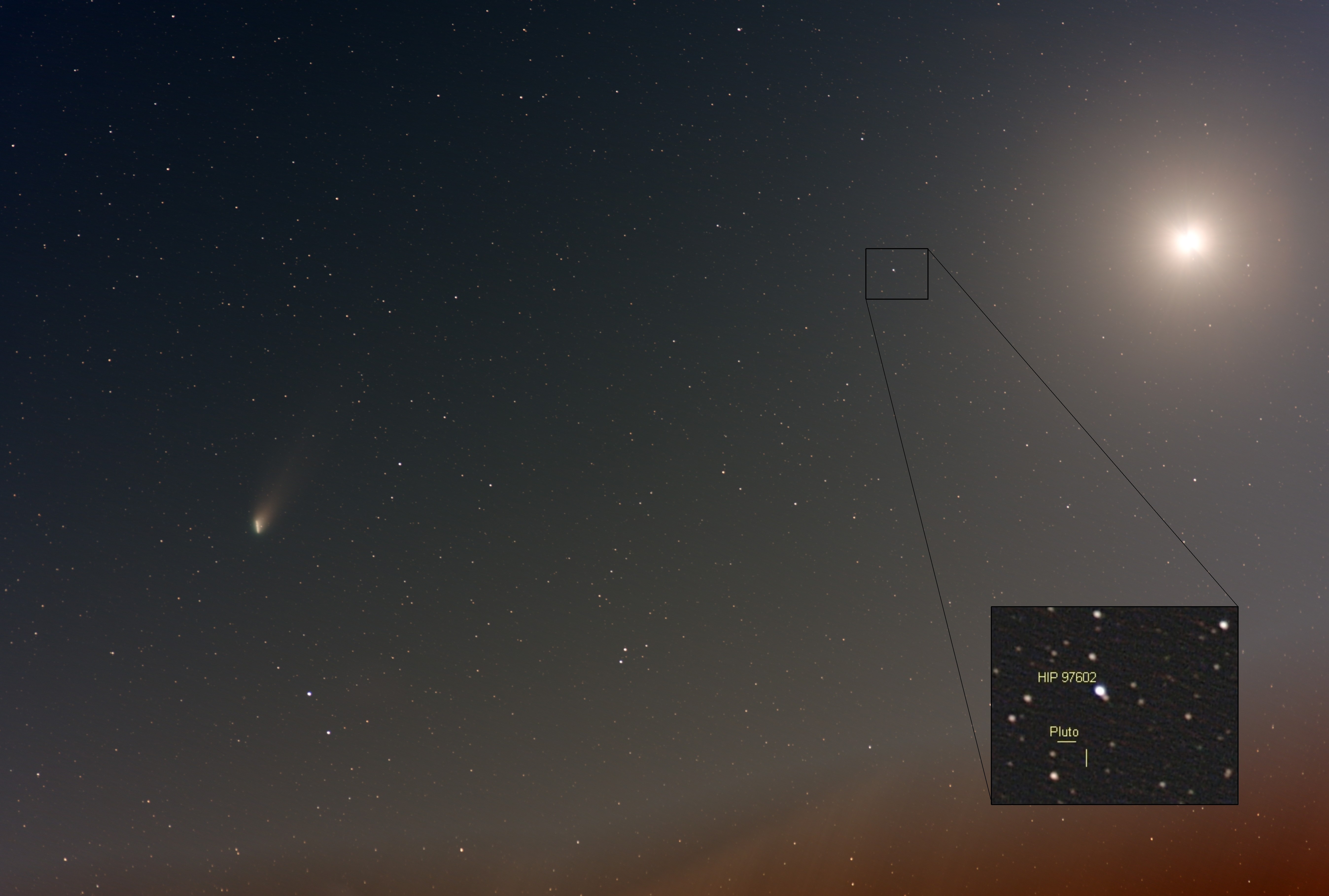 Am Abend des 17. Dezember passierte der Komet Leonard den Planeten Venus in nur 5 Grad Abstand und es bot sich eine schöne Gelegenheit, dieses ungleiche Paar auf einem Foto abzubilden. Interessanterweise befand sich auch noch der Zwergplanet Pluto im Bildfeld nahe der Venus, der sich beim Stacken auf die Sterne gerade noch erkennen lässt. Zum Zeitpunkt der Aufnahme haben Venus und Pluto einen Winkelabstand von 1,5 Grad. Bei der Konjunktion 6 Tage zuvor waren es sogar nur 9 Bogenminuten. Trotz gutem Wetters und perfekter Beobachtungsgeometrie auf 24 Grad südlicher Breite in der chilenischen Atacama (ca. 55 km südlich von Antofagasta) war es in dieser Nacht aufgrund des hell strahlenden Vollmonds nicht möglich, tiefer belichtete Aufnahmen zu machen. Das mit 300 mm Brennweite bei Blende 2,8 insgesamt 15 Minuten belichtete Foto (30 Aufnahmen zu je 30 s) entstand in der späten Dämmerung, bei einem mittleren Sonnenstand von -16° und einer mittlere Höhe des Kometen von 8°. Während dieser Zeit bewegte sich der Komet gegenüber den Sternen um ca. 3 Bogenminuten.