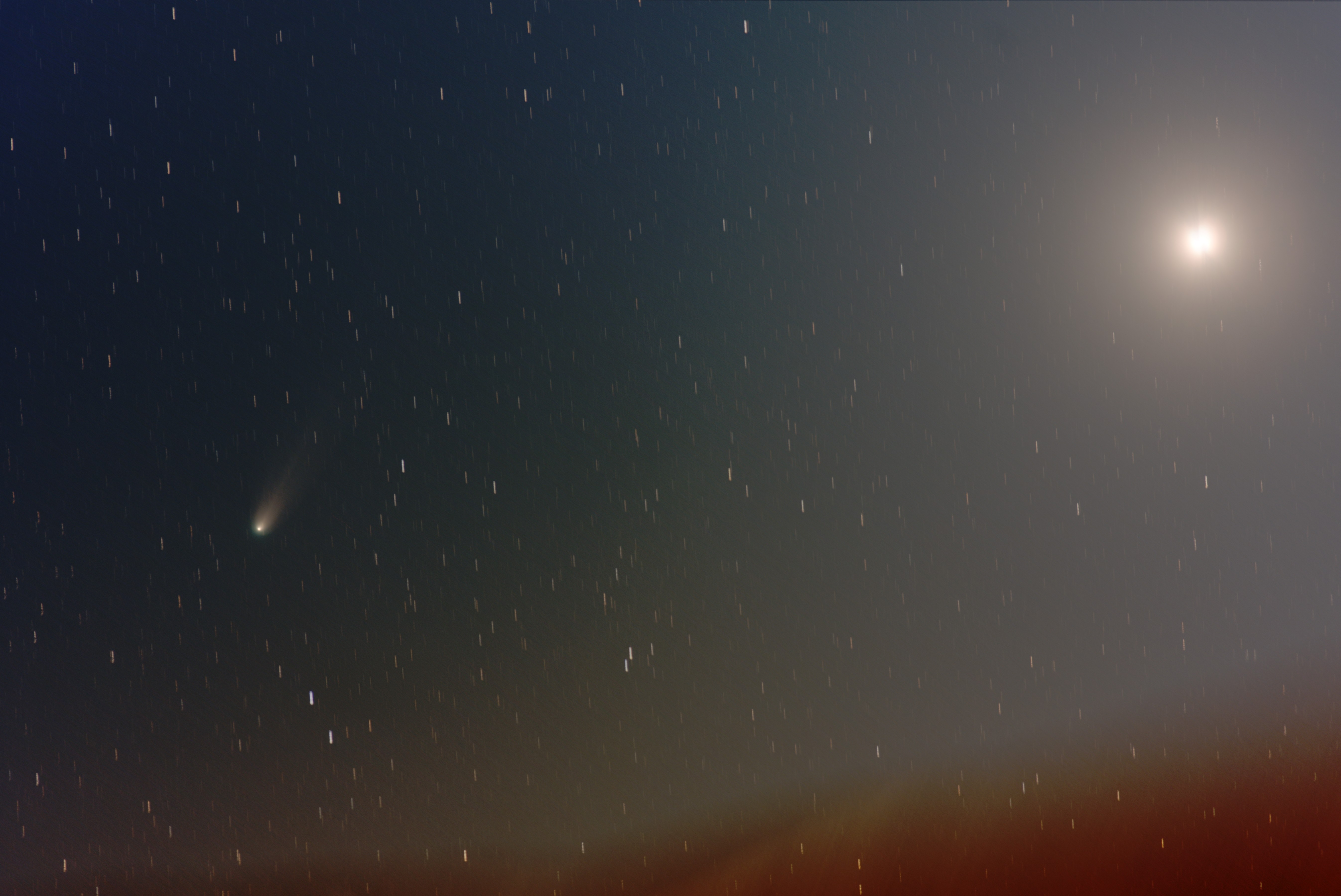 Am Abend des 17. Dezember passierte der Komet Leonard den Planeten Venus in nur 5 Grad Abstand und es bot sich eine schöne Gelegenheit, dieses ungleiche Paar auf einem Foto abzubilden. Trotz gutem Wetters und perfekter Beobachtungsgeometrie auf 24 Grad südlicher Breite in der chilenischen Atacama (ca. 55 km südlich von Antofagasta) war es in dieser Nacht aufgrund des hell strahlenden Vollmonds nicht möglich, tiefer belichtete Aufnahmen des horizontnahen Kometen zu machen. Das mit 300 mm Brennweite bei Blende 2,8 insgesamt 15 Minuten belichtete Foto (30 Aufnahmen zu je 30 s) ist auf die Bewegung des Kometen gestackt, der sich in dieser Zeit gegenüber den Sternen um ca. 3 Bogenminuten weiter bewegte. Interessanterweise befindet sich auch noch der Zwergplanet Pluto im Bildfeld nahe der Venus, der sich beim Stacken auf die Sterne gerade noch nachweisen lässt.