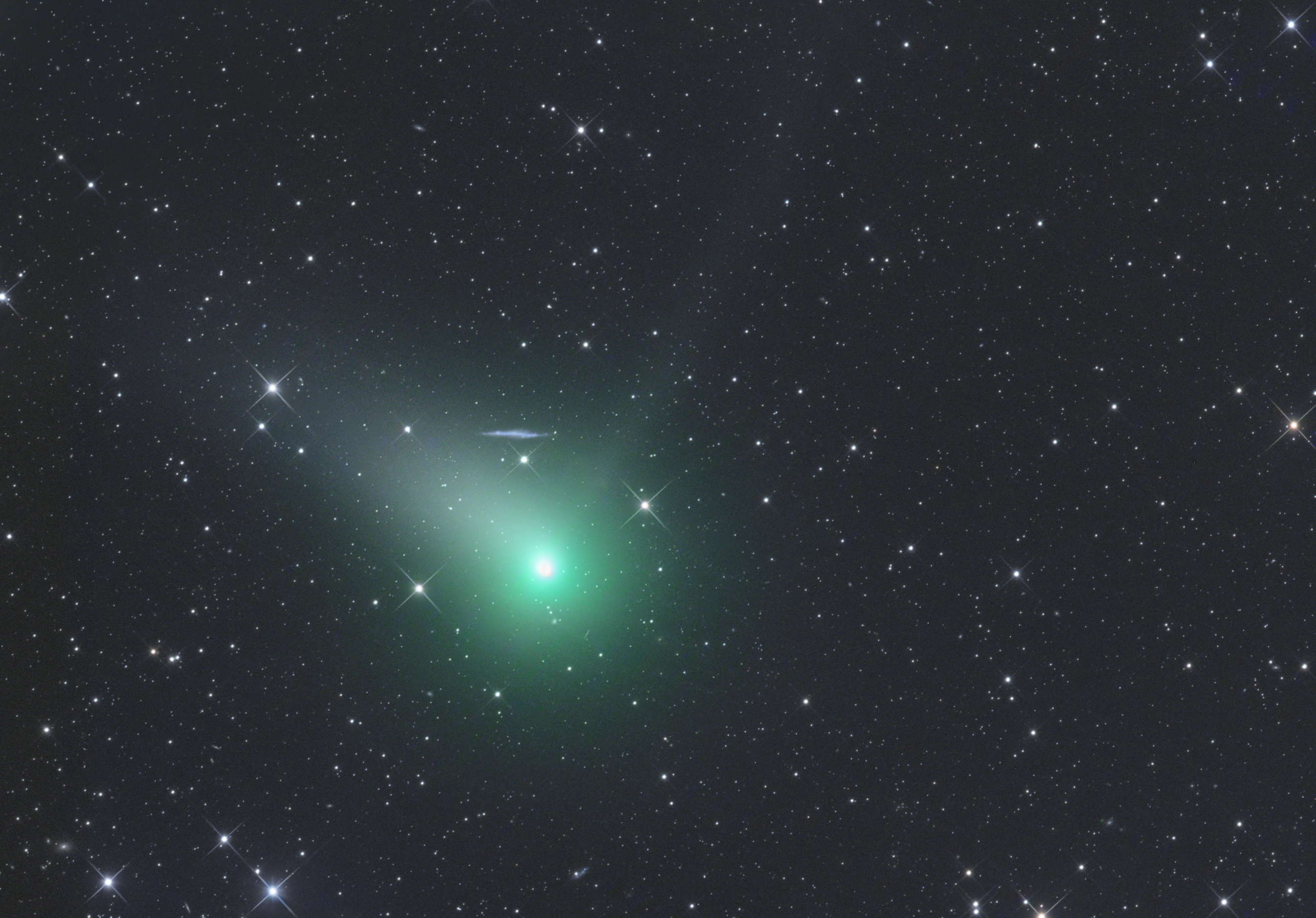 Nach guter Planung (der Komet bewegt sich sehr schnell) steht Galaxie NGC 7064 genau in der Koma.