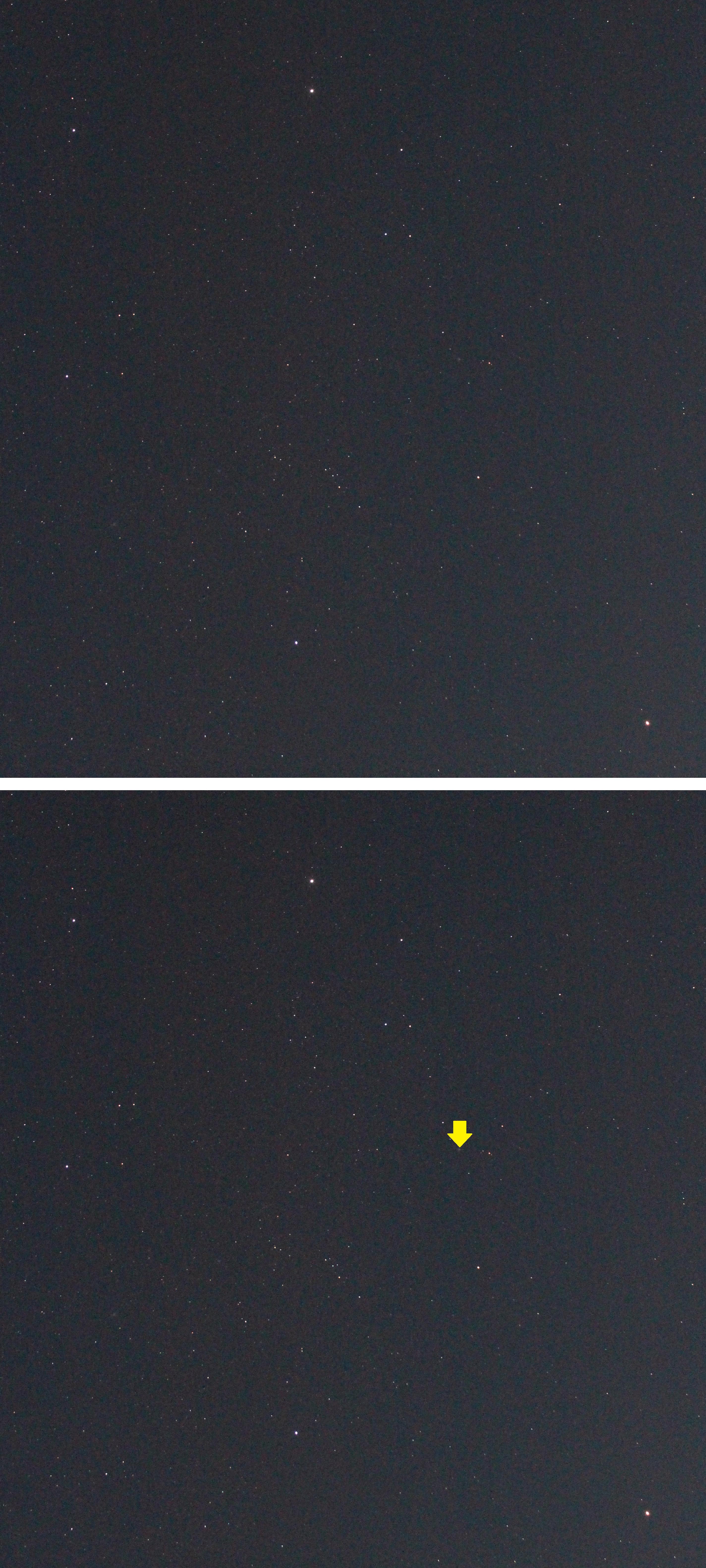 Komet C/2022 E3 (ZTF) im Sternbild Fuhrmann, fotografiert westlich vom Sindelfinger Ortsteil Maichingen. Auf dem unteren Bild, das zur gleichen Zeit mit den gleichen Belichtungsparametern wie das obere Bild aufgenommen wurde und das auch den gleichen Himmelsausschnitt zeigt, ist der Komet C/2022 E3 (ZTF) mit einem gelben Pfeil markiert.