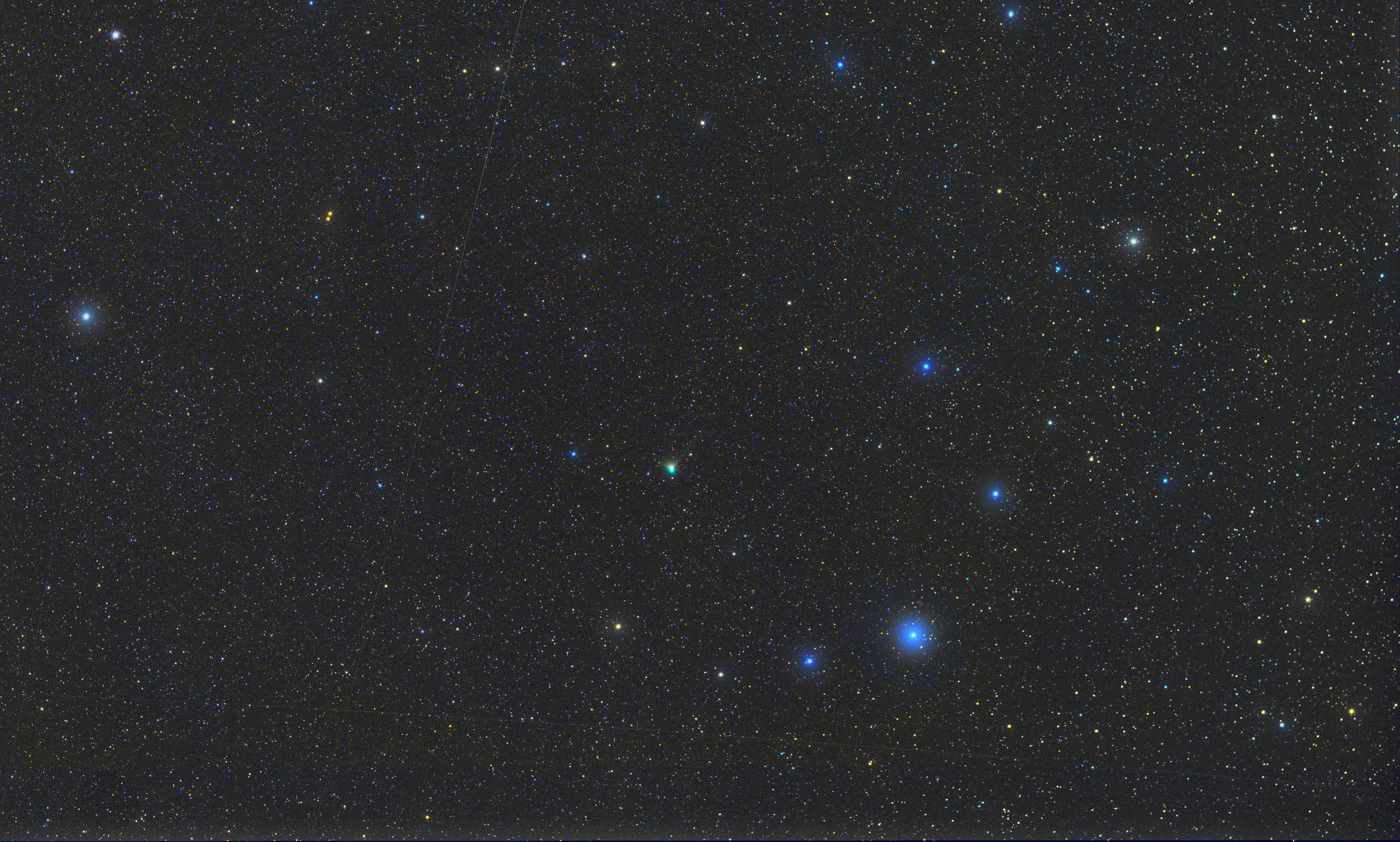 Der 7m4 helle Komet ZTF inmitten der Nördlichen Krone ist auf dieser f-50mm Aufnahme ein kleines grünliches Objekt