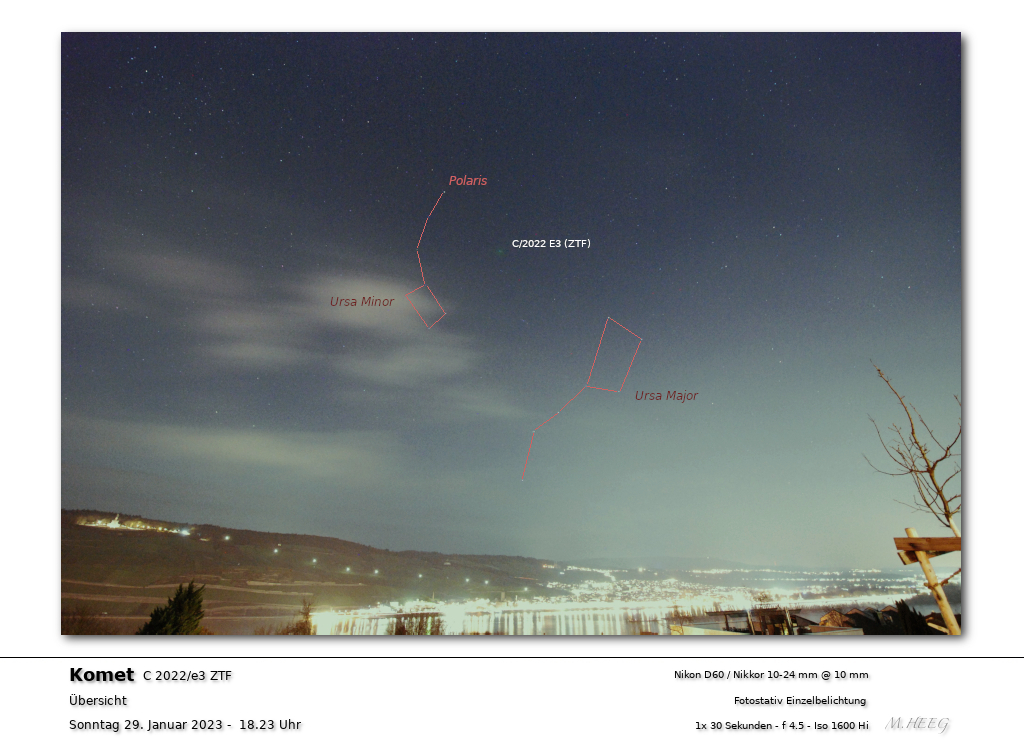 Seit die Beobachtung des Kometen C/2022 E3 ZTF bei mir (grundsätzlich) möglich ist, hat es das Wetter nie zugelassen. Meine Fotos zeigen etwas weitwinklig und schnell via DSLR ohne Nachführung in einem kurzen Beobachtungsfenster im Wolkenzug möglich war ... Trotz allem bin ich aber froh überhaupt etwas, wenn auch sehr klein, ohne viele Details, abgelichtet zu haben. Übersicht / Kometenposition bei 10 mm Brennweite im Wolkenzug am Sonntag, den 29. Januar 2023 um 18:23 Uhr. Viele Grüße, Marco Heeg