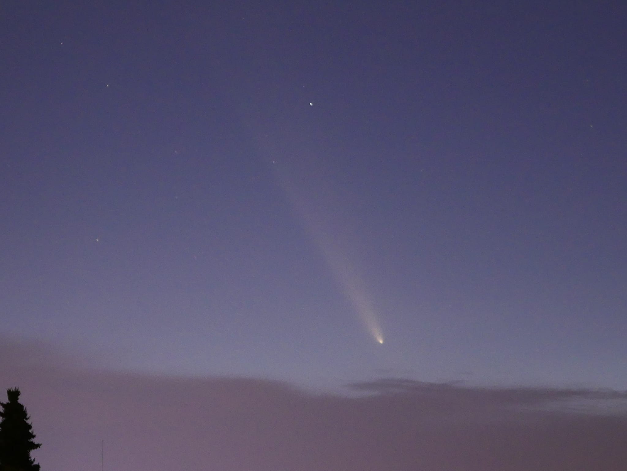 Komet Tsuchinsan tief im Westen kurz nach Sonnenuntergang über Fellbach. Aufnahme mit einfacher Systemkamera Lumix G70 und Teleobjektiv 200 mm, Belichtung 5 sek auf fixer Montierung