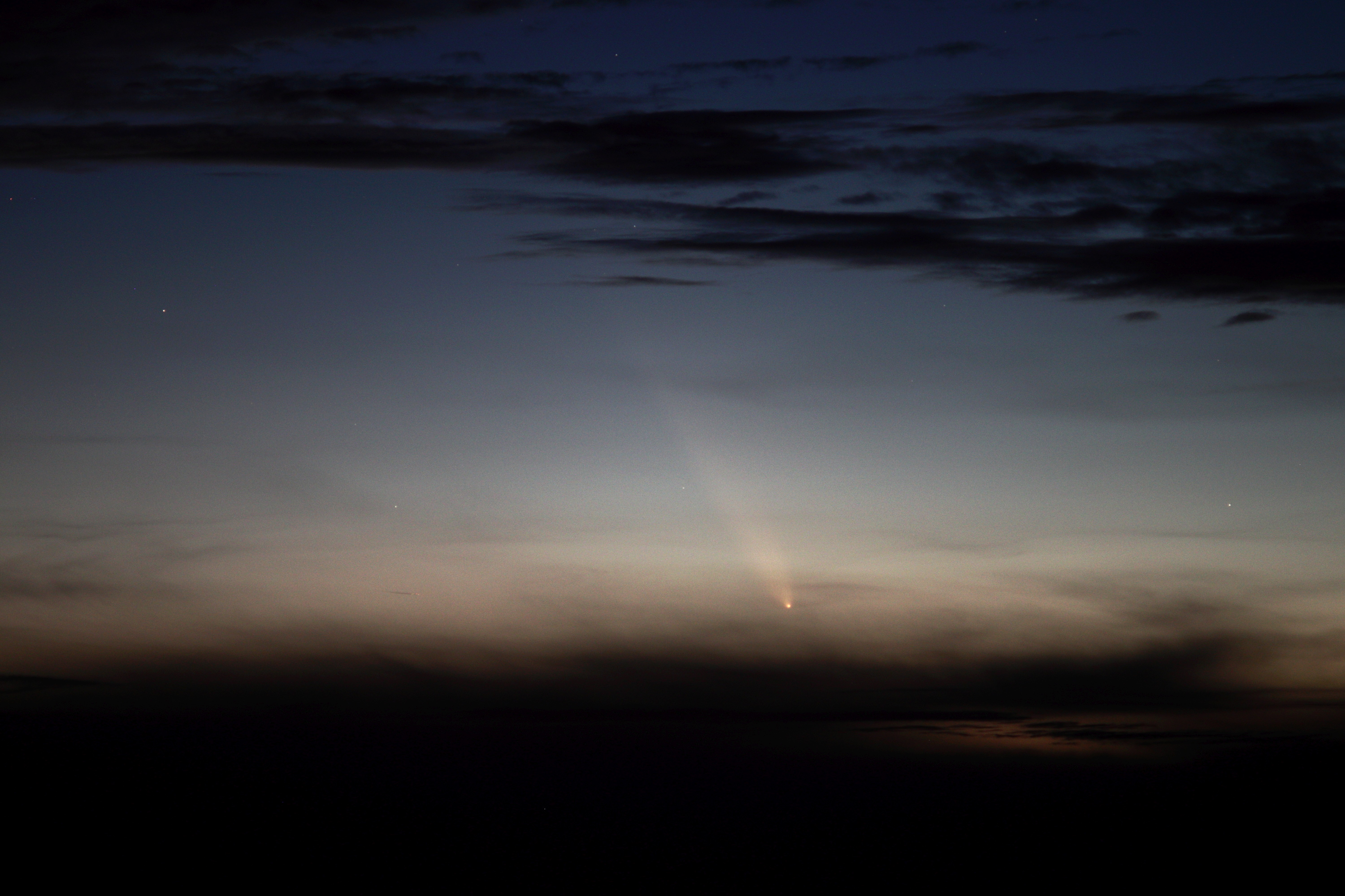 Glück gehabt, es gab Wolkenlücken am Nebelstein im nördlichen Niederösterreich, 1017 m hoch. Der Komet war über einer Nebelbank in zwei Grad Höhe schwach freisichtig! Der Komet muss wohl +1 mag oder 0 mag hell sein, um ihn bei diesem Dämmerungsstand (Sonnentiefe 12 Grad) mit freiem Auge sehen zu können. Am Gipfel des Nebelsteins war es kalt +5°C und sehr windig mit Böen, richtig ungemütlich, aber in den Wolkenlücken gab es klaren Himmel.