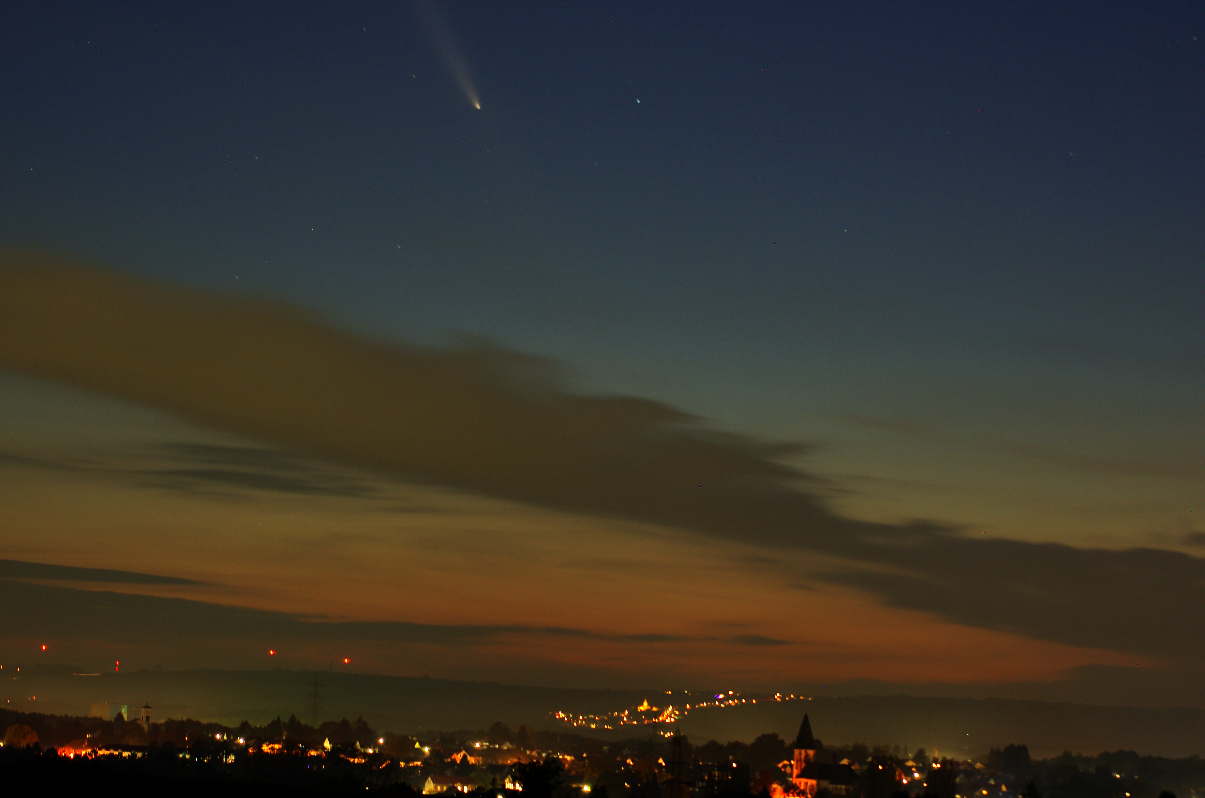 Die Polarlichter letzte Woche habe ich wegen schlechten Wetters verpasst. Aber ich war jeden Tag auf der Lauer, um den Kometen zu fotografieren. Am Montagabend riss die Wolkendecke für vielleicht eine halbe Stunde auf und das hat dann gereicht, um den flüchtigen Gesellen zu fotografieren. Aufgenommen habe ich ihn von der Römerstraße in Schwalbach mit dem Blick über Schwalbach, im Hintergrund ist Felsberg.