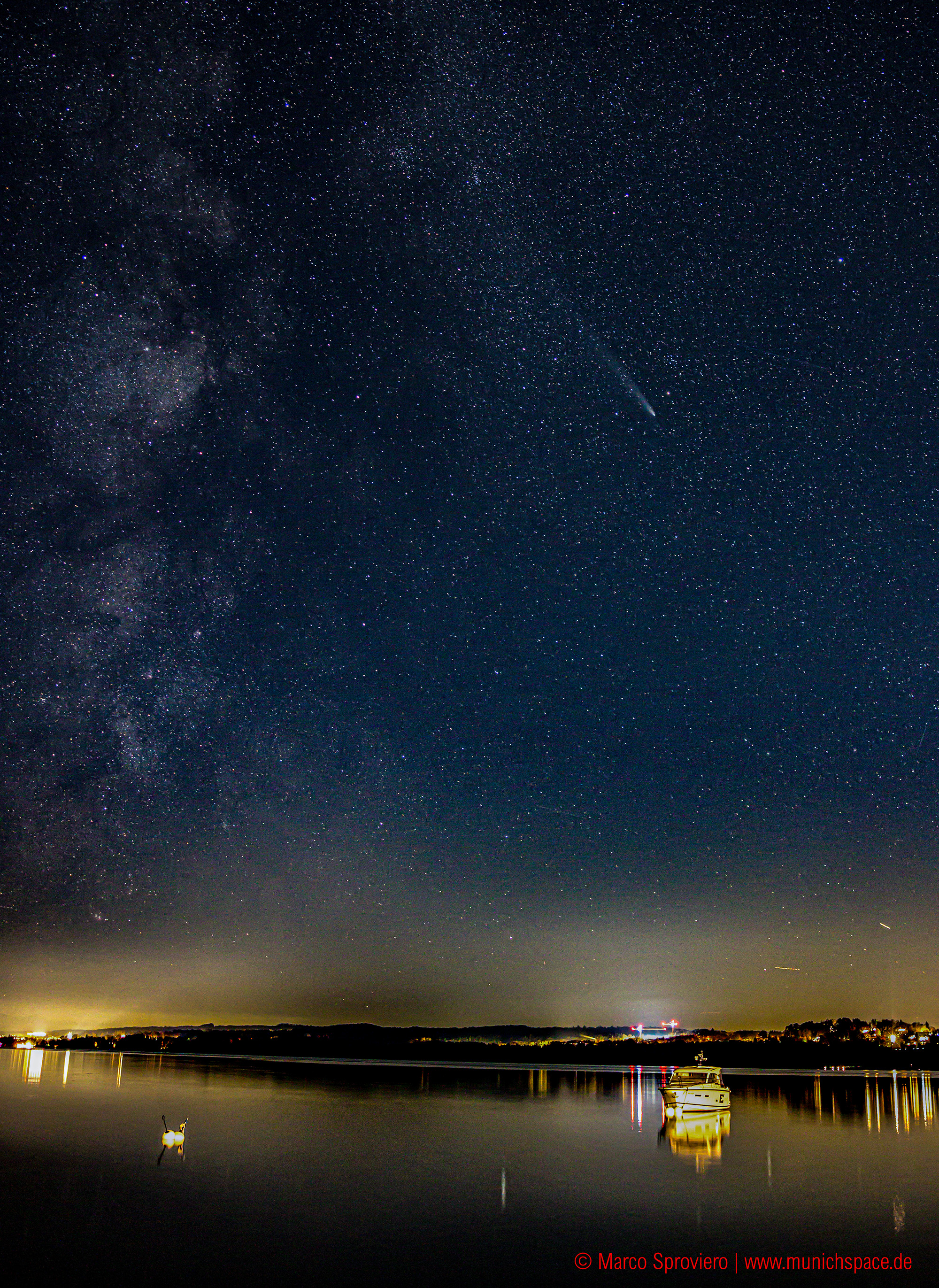 Kurz bevor der Komet C/2023 A3 Tsuchinshan-ATLAS aus dem Blickfeld verschwindet, konnte ich ihn am Ostufer des Starnberger Sees noch fotografieren. Schön zu sehen ist links davon die Milchstraße und schräg links über dem Kometen die beiden offenen Sternhaufen IC 4756 und NGC 6633.