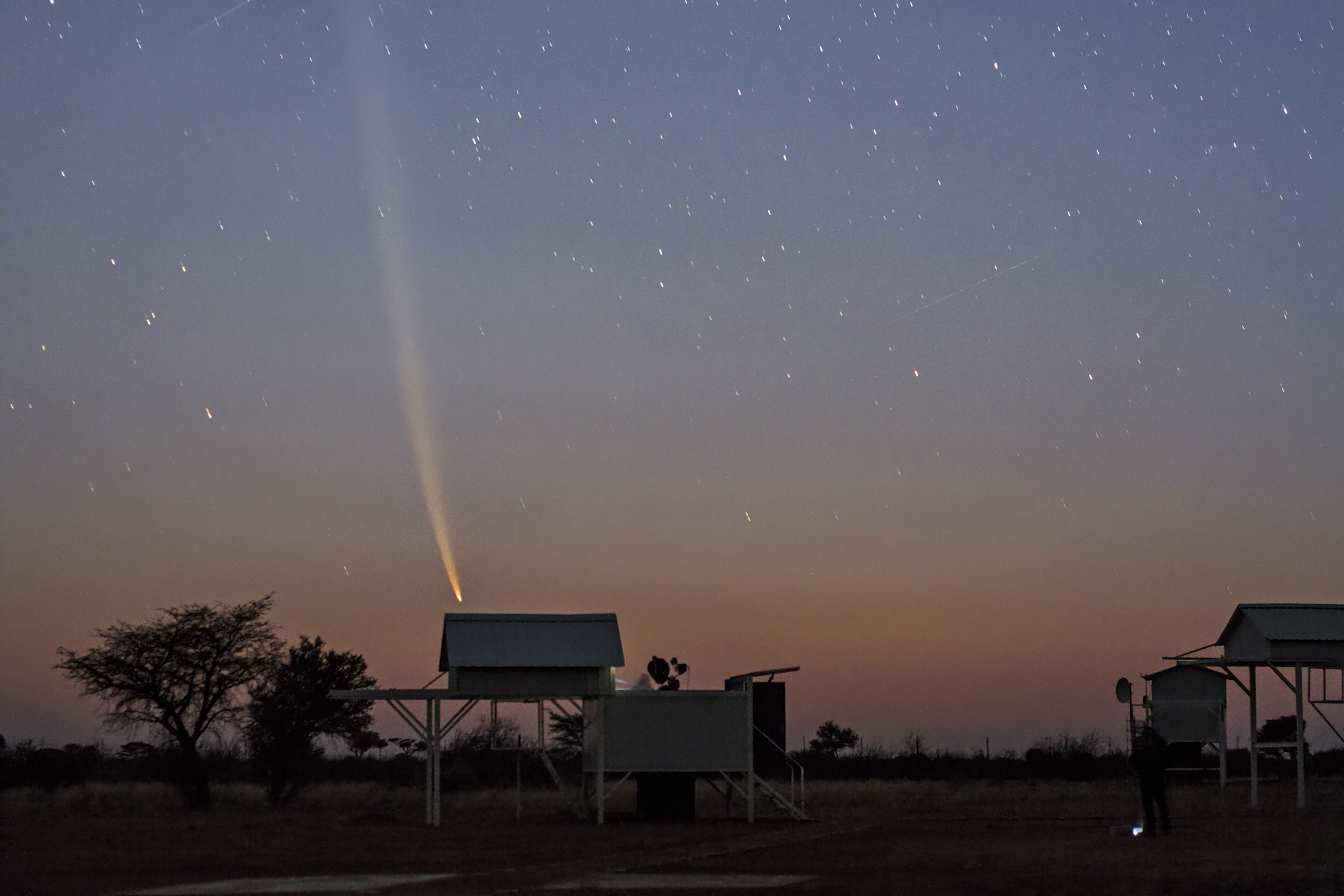Dieses Bild entstand am letzten Morgen vor unserer Abreise aus Namibia. Die Besonderheit: Der Komet steht direkt über der Sternwarte und man kann drinnen eine Person erkennen (Dennis) und rechts vor der Sternwarte steht Michael. Es ist eine gute Erinnerung an viele schöne Tage. Michael Jäger, Dennis Möller und Gerald Rhemann