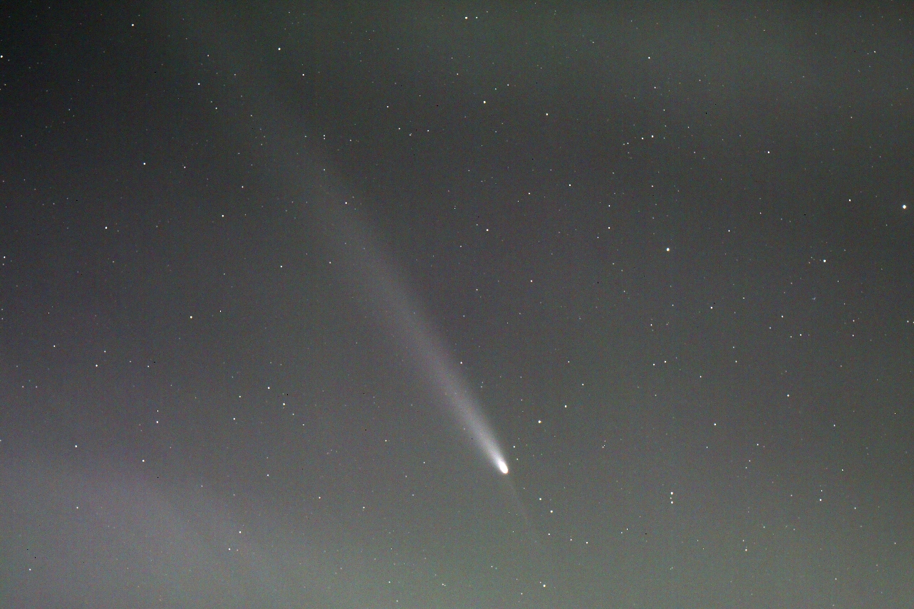 Schlechtwetter mit dauerhaft wolkigem oder verzirrtem Westhorizont ermöglichten erst heute am aufgehelltem Vollmondhimmel die Aufnahme des schon schwachen Kometen. Bei diesen Aufnahmen blies zusätzlich ein heftiger SO-Föhnwind. Auch das Auffinden am Dämmerungshimmel visuell mit Feldstecher und dann im Display der Kamera erforderte einige Geduld!