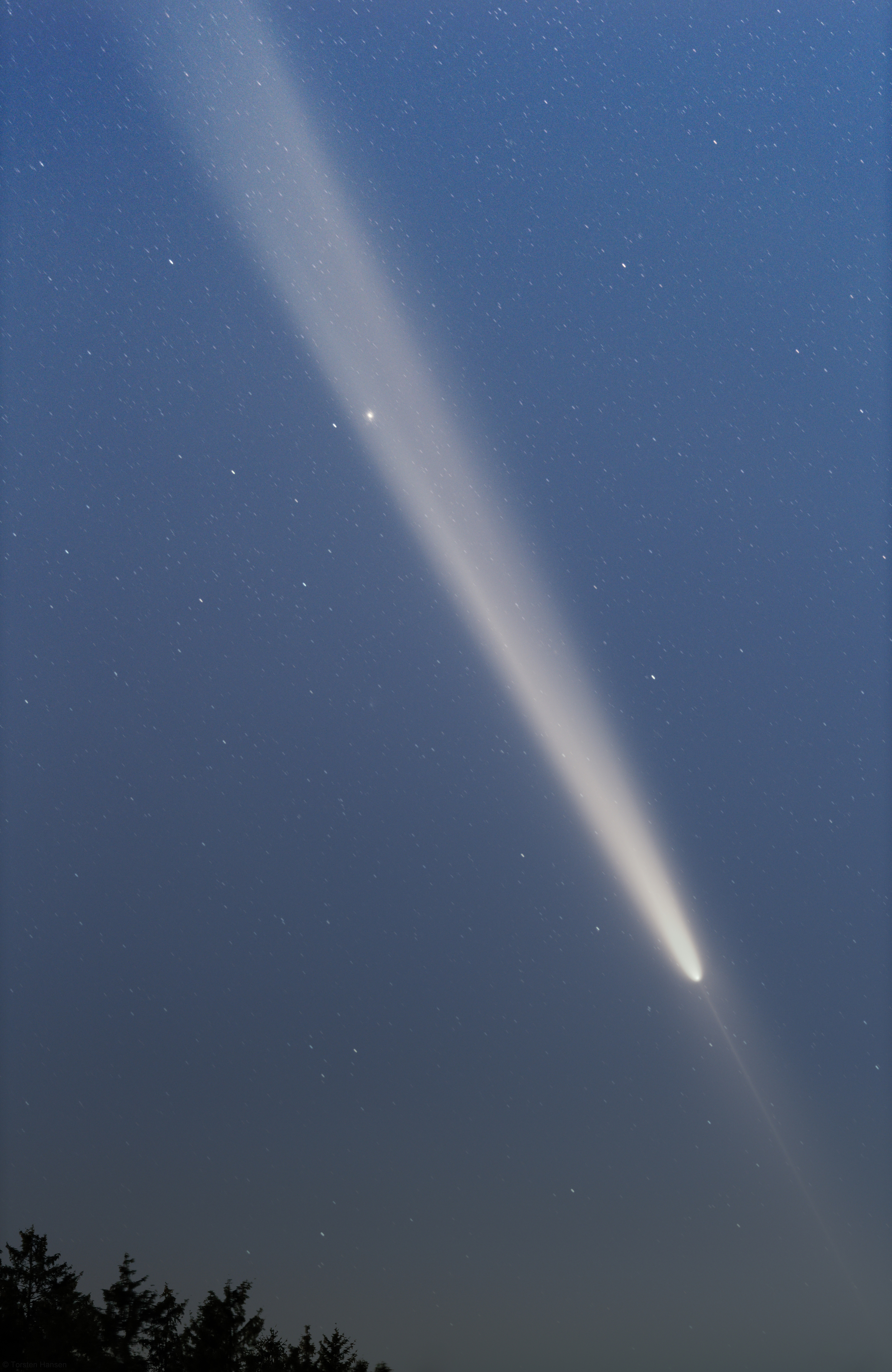 Komet C/2023 A3 am Abend des 14. Oktober 2024. Mit bloßem Auge war bereits in der ausgehenden Dämmerung ein deutlicher Schweif zu erkennen. Später dann mindestens visuell 8° Länge, im Fernglas auch der Gegenschweif. Der Komet zeigt einen gut sichtbaren Gegenschweif, der sowohl als Nadel als auch als Halo zu erkennen ist und so die Blickgeometrie erahnen lässt.