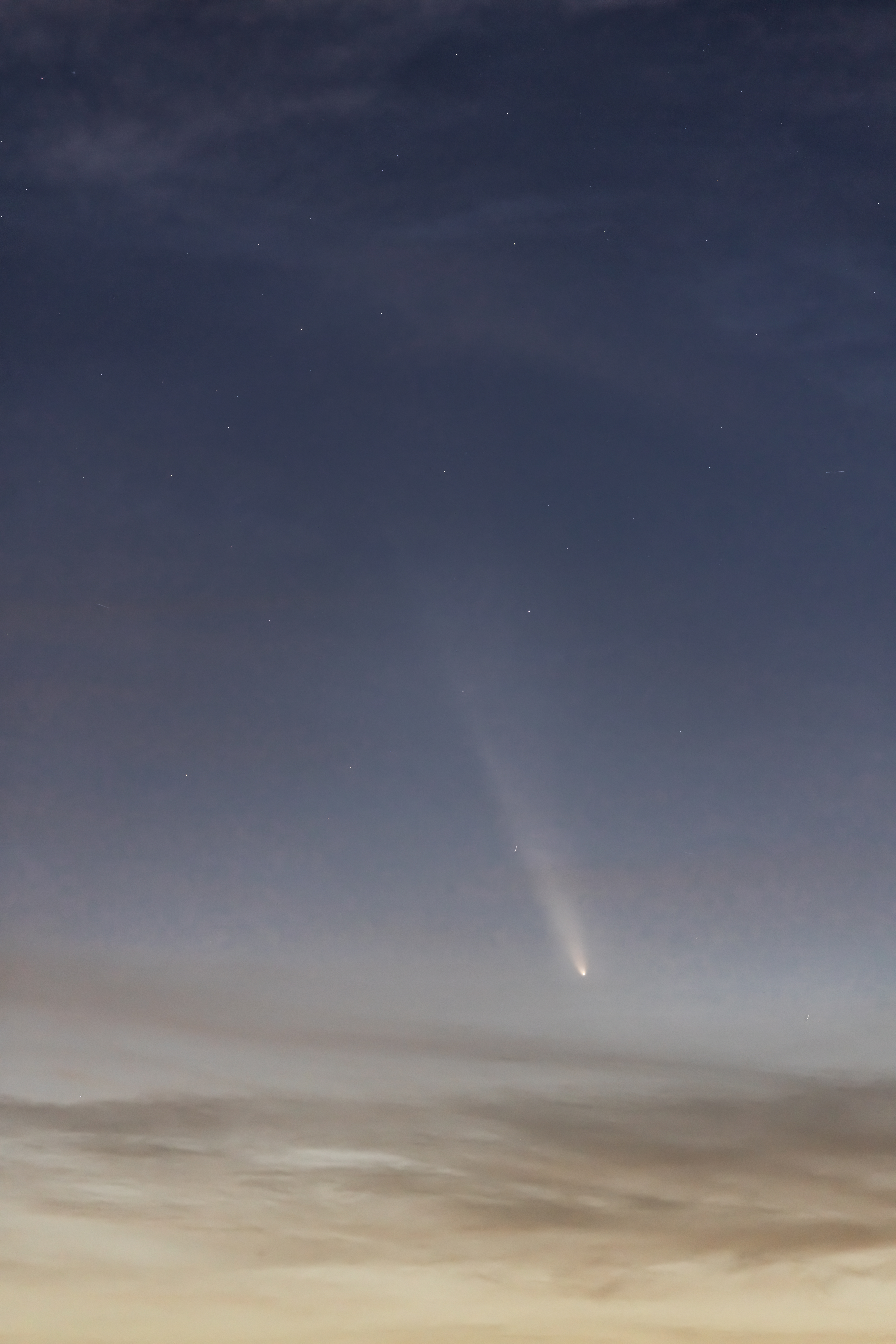 Der Komet stand sehr niedrig am Himmel von Mallorca. Es gab niedrige Wolken. Vom Beobachtungsort im Tramuntana-Gebirge in etwa 400 m Höhe aus gesehen, lagen die Wolken unten. Am Horizont war jedoch eine recht dichte Eintrübung. Zwischen störenden Schichten entstand das Foto mit 135 mm Brennweite bei Blende 2,0 und 0,8 sek Belichtung.