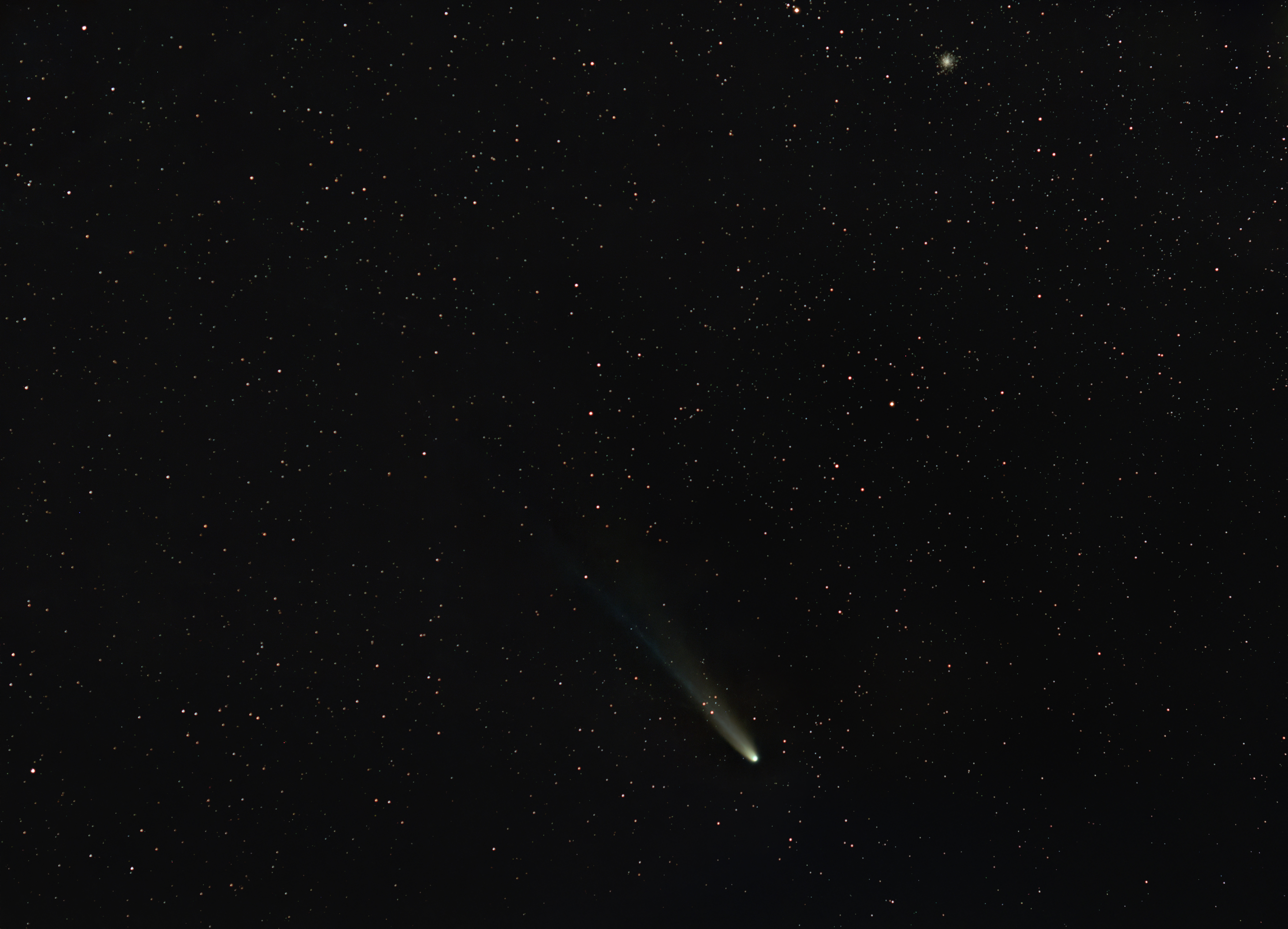 Letzter Gruß vom Komet Lemmon; heute am 7. November 2025 gab es noch ein kurzes Zeitfenster, um den relativ hellen Kometen zu fotografieren. Im Bild oben rechts lässt sich noch der Kugelsternhaufen Messier 10 erkennen. Der Komet begibt sich in den nächsten Tagen unten den Horizont, um so erfreulicher, ihn heute nochmal vor die Linse zu bekommen.