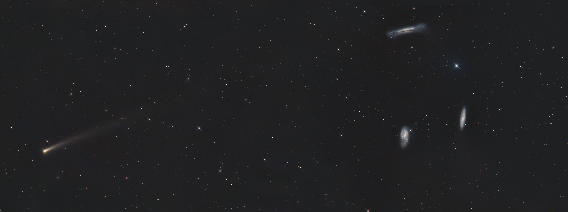 Der »goldene Komet« beim Leo-Triplett: Das goldene Erscheinungsbild dieses Kometen rührt vermutlich daher, dass sein Gasschweif hauptsächlich aus H2O+ besteht, der eine eher rötliche Erscheinungsart hat, während sonst hauptsächlich CO+ den bläulichen Charakter eines Ionenschweifs ausmacht. Das Bild ist ein Mosaik aus zwei Feldern.