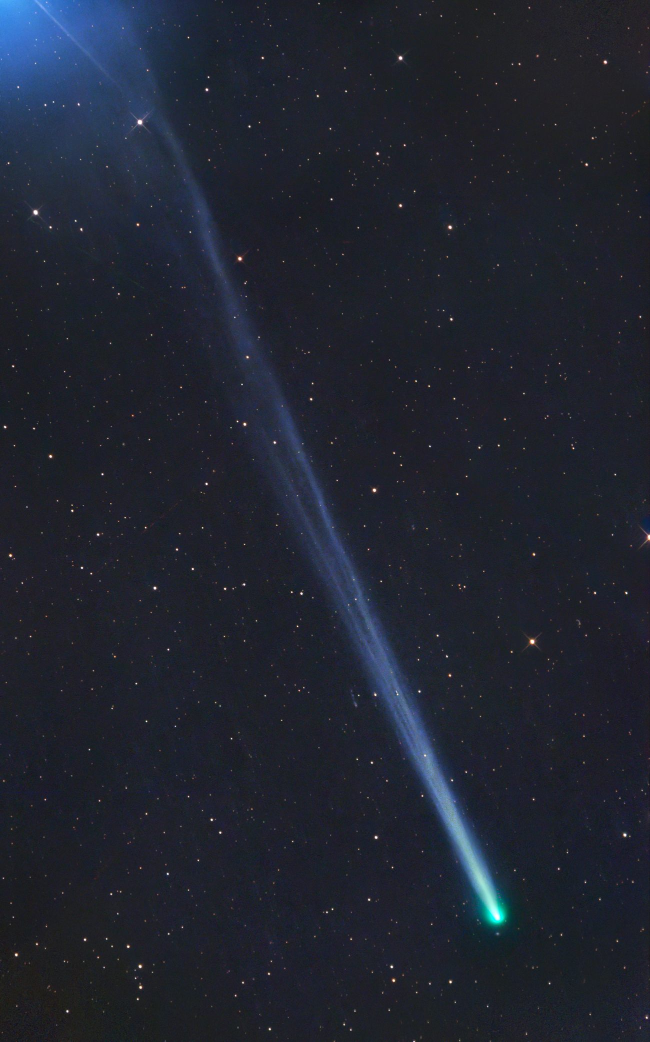 Der Komet zeigt hier einen geschwungenen Gasschweif. Die blaue Aufhellung am Ende des Schweifs ist die Einstrahlung des hellen Sterns Spica im Sternbild Jungfrau.