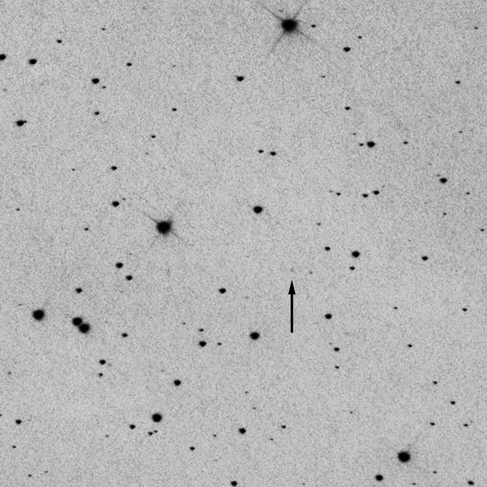 Der Komet war an diesem Morgen gerade einmal 17,6mag hell, aber durchaus in Reichweite für einen 8" f/5-Newton mit digitaler Spiegelrelexkamera. Für dieses Bild belichtete ich sieben Aufnahmen auf 1600 ASA mit je 10 Minuten Belichtungszeit. Nach einer Rauschreduktion und einer Kontrastanpassung erscheint der Komet exakt an der vorausberechneten Stelle!