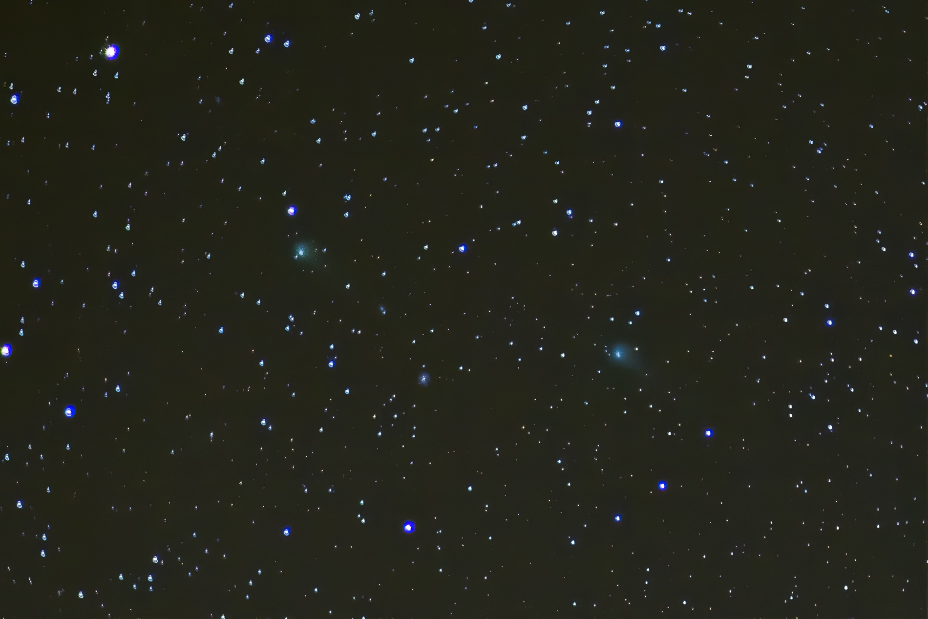 Ich wollte mit meiner einfachen Reiseausrüstung im Hinterhof den Kometen C/2017 T2 im Grossen Bären finden und in zwei Nächten ablichten. Justierung manuell auf Polarstern. Zwei Bilder manuell übereinander gelegt, aufgenommen jeweils um 00:10 Uhr am 12. und 13. Juni 2020. Mobiles Equipment: Nikon D7500 mit Tele 180 mm f3,5, Belichtung 180 s bei ISO 800. Nachführung mit Star Adventurer. Alle Justierungen von Hand. Processing mit Photoshop, Überlagerung, Farbkorrektur, Helligkeit, Kontrast, Hochpass Filter und Denoise.