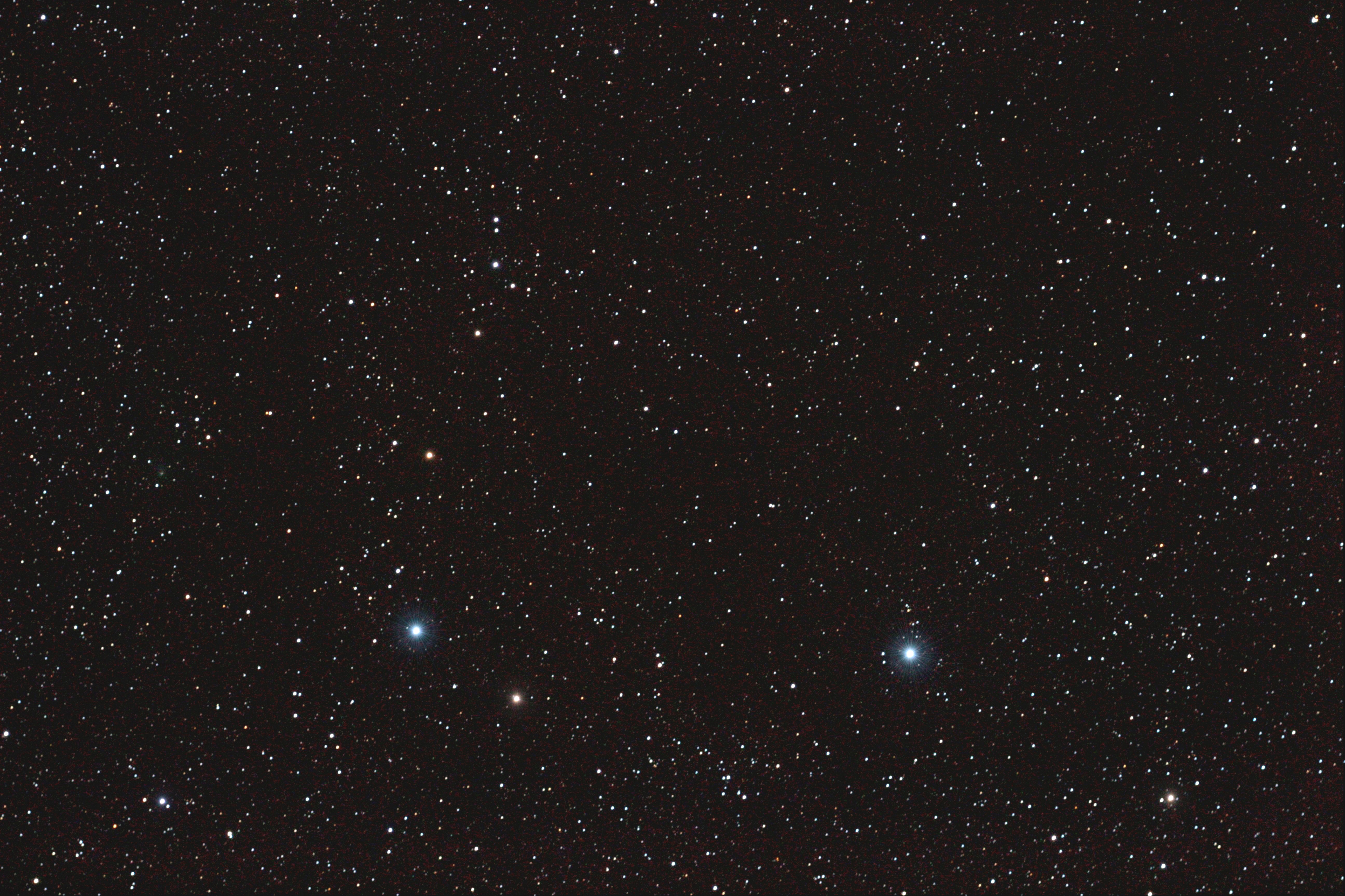 Nach dem Stacken von 40 Bildern war der Fall klar. Ziemlich am linken Rande des Bildes war der Komet zu sehen. Gerade noch so, dank der kleinen Brennweite des Q 100/560.