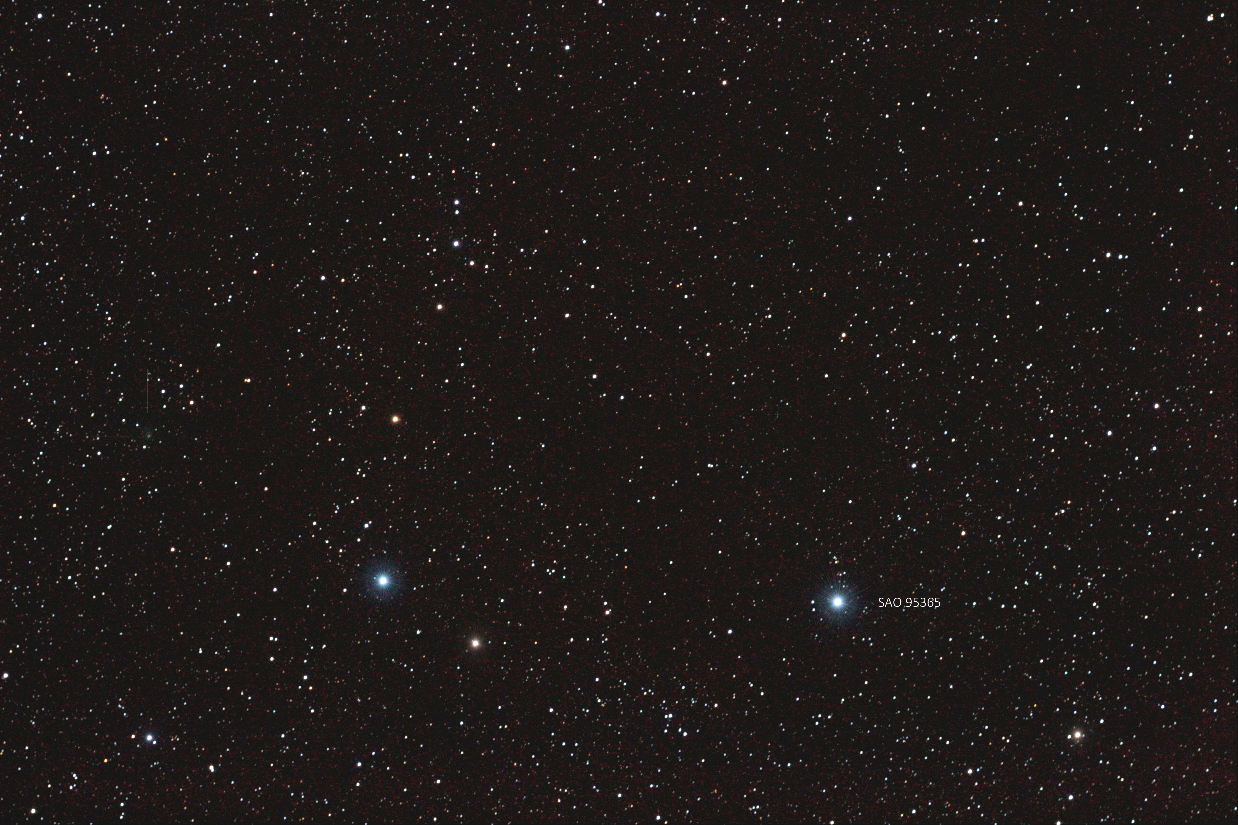 Auf Infrarotaufnahmen des NEOWISE-Satelliten vom 3. Januar 2021 wurde der Komet C/2021 A2 (NEOWISE) entdeckt. Er näherte er sich der Erde und passierte diese am 3. Februar im Abstand von 0,51 AE. Am 13. Februar in den Vogesen, wo es deutlich dunkeler ist als bei mir in der Kleinstadt, konnte ich ihn zwischen Orion und den Zwillingen erhaschen. Ein Komposit von lediglich zwei Bildern zu 60 Sekunden mit IRIS zeigt den schwachen Gesellen links am Bildrand (12,8 mag). Bin froh, ihn überhaupt geortet zu haben, da ein Refraktor 100/580 mm einem 17-Zoll-Planewave doch haushoch unterlegen ist. Seit es Calsky nicht mehr gibt, habe ich leider keine präzise Daten mehr und somit war er nicht zentral im Bild. Um so größer die Freude, wenn es trotzdem klappt.