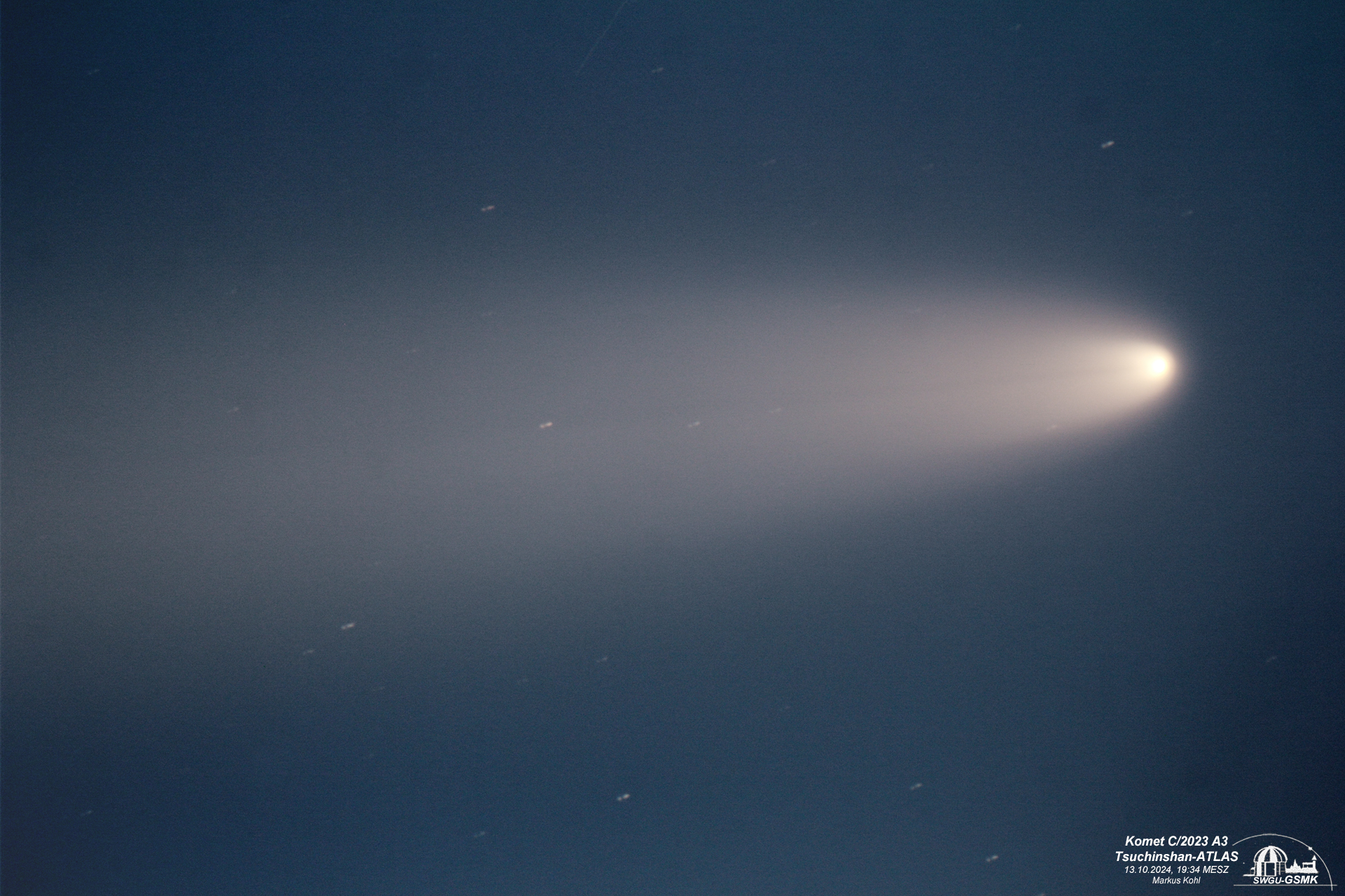 Am Sonntagabend, 13. Oktober 2024 hatte ich mein erstes Abendglück mit diesem herrlichen Kometen. In der Dämmerung war er mit einem immensen Schweif mit freiem Auge sichtbar und erst im Teleskop! Wo der feine Streifen herkommt, der von der Koma heraus zu sehen ist, kann ich nur raten - eventuell ein Schweifteil, der weniger Sonnenlicht reflektiert.