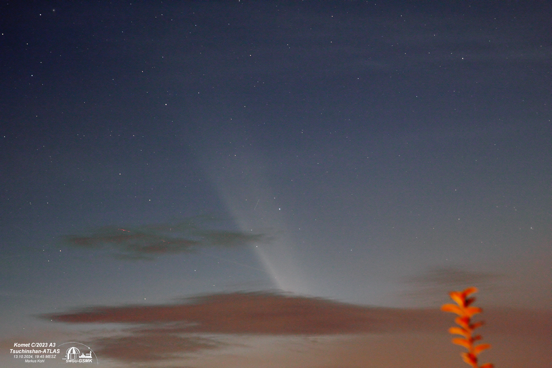Am Balkon habe ich dann noch mit Walimex Pro 85 mm bei f/2.8 belichtet, wo der Komet selbst schon verschwunden war, aber man sieht schon den langen Schweif, der trotz Himmelsaufhellung und Wolken noch in den Himmel ragt!