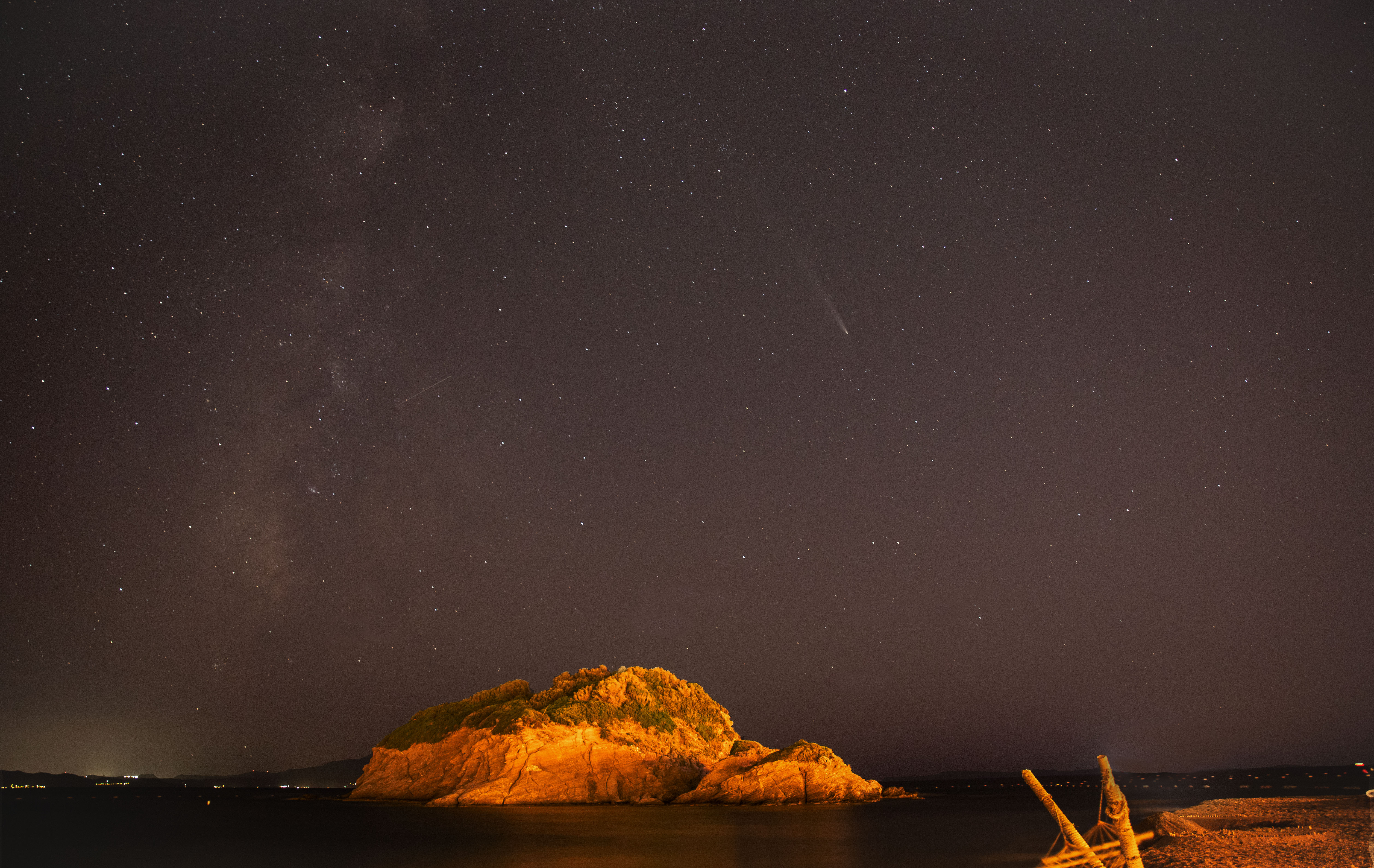 Die Aufnahme entstand im Urlaub in der Türkei, nahe Izmir. Der Komet war bei der Aufnehme ähnlich hell wie die Milchstraße. Leider war die Umgebung sehr hell. Am Horizont die Insel Samos.