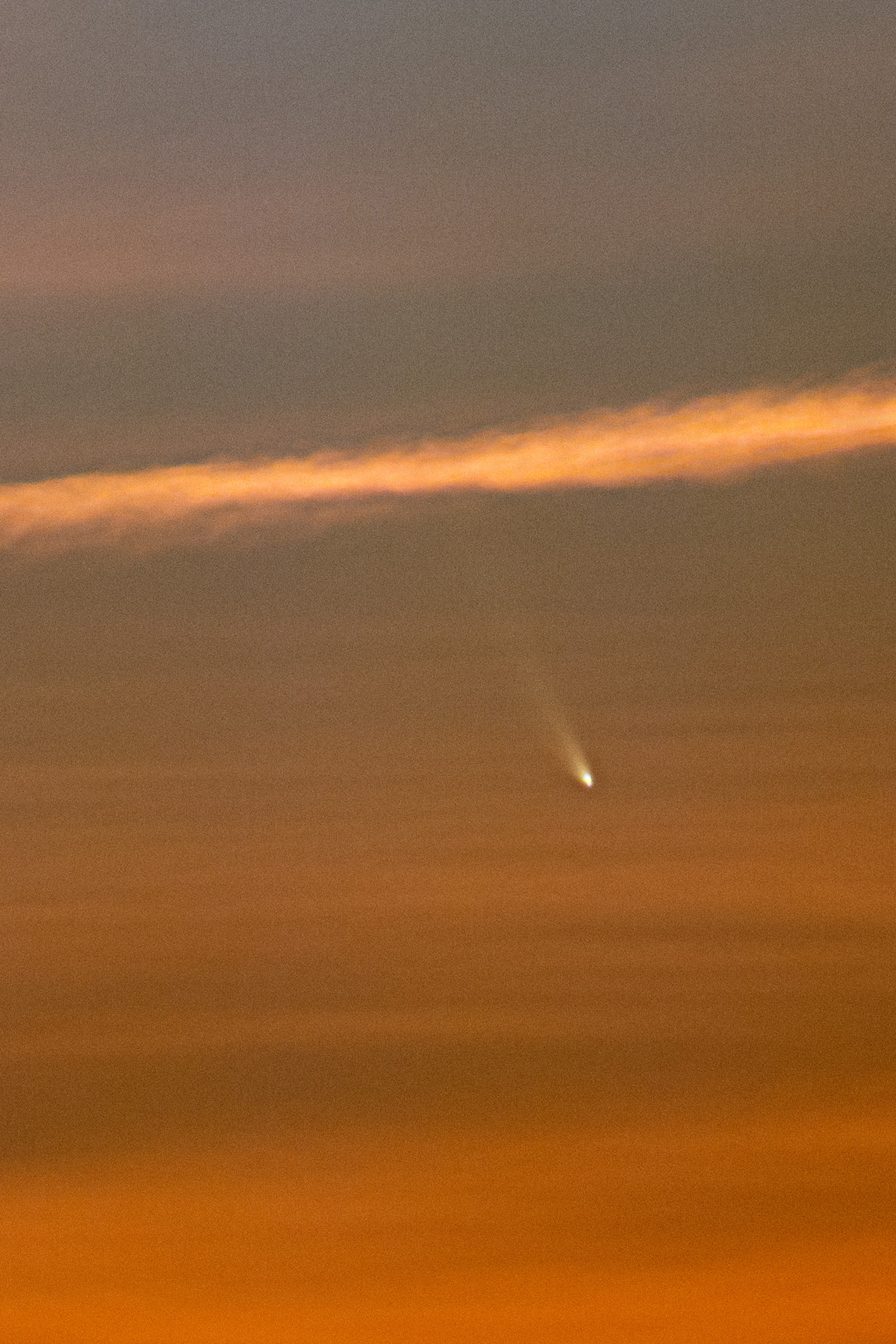 Nachdem ich den nur für wenige Tage von der nördlichen Hemisphäre aus sichtbaren Kometen C2024/G3 (ATLAS) bereits an seinem Perihel am 13. Januar beobachten und fotografieren konnte, war er am Tag darauf in der Abenddämmerung und bei etwas gewachsenem Sonnenabstand schon ein wenig besser zu sehen. Die Aufnahme aus vier gestackten Einzelbildern entstand mit einem TEC 140 bei 980mm Brennweite und einer Canon 60Da. Die dünnen Zirren belebten die Szenerie noch zusätzlich.