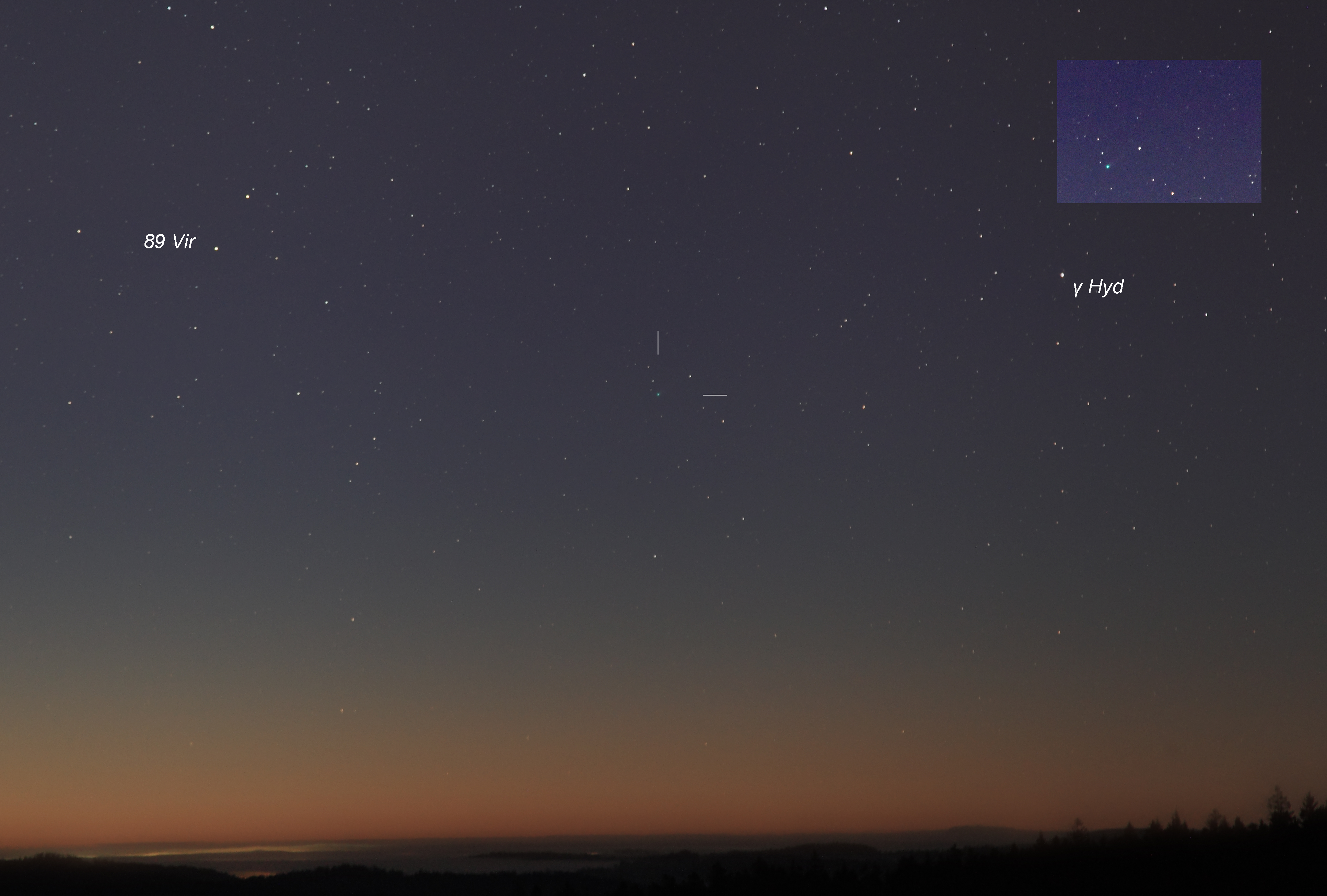 Oberhalb der dichten Nebeldecke des Mühltals am Südrand des österreichischen Böhmerwaldes herrschten in den Morgenstunden des 25. November 2020 beste astronomische Bedingungen für die Fotografie des Kometen Erasmus. Da er sich sehr schnell in den nächsten Tagen der Sonne angenähert hat, nutzte ich gleich die erstmögliche Gelegenheit zu seiner Beobachtung. Der traumhafte Wintersternhimmel über mir, die gleißende Venus und Merkur im Südosten sowie das gelungene Bild waren ein unvergesslicher Start in den neuen Tag! Knapp vor Sonnenaufgang zeigten sich wunderbare Dämmerungsstrahlen und in etwa 125 km Entfernung der Ötscher, ein Gipfel der niederösterreichischen Kalkalpen, in einer herrlichen Luftspiegelung!