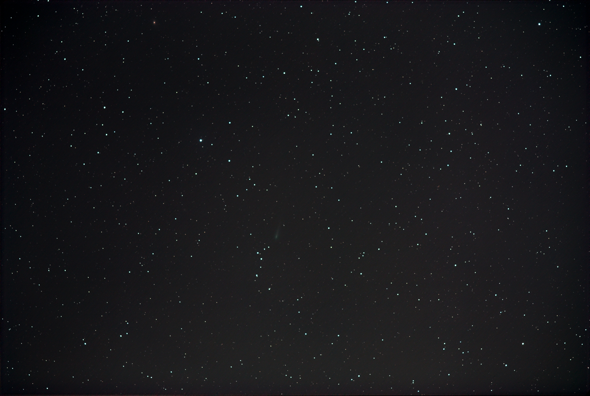 Bei teilweise schleierartiger Bewölkung und einigen Kondensstreifen, die über den Bereich des Kometen hinwegzogen, konnte ich doch über 40 Aufnahmen mit 30sec Belichtungszeit machen und diese dann zusammenrechnen.