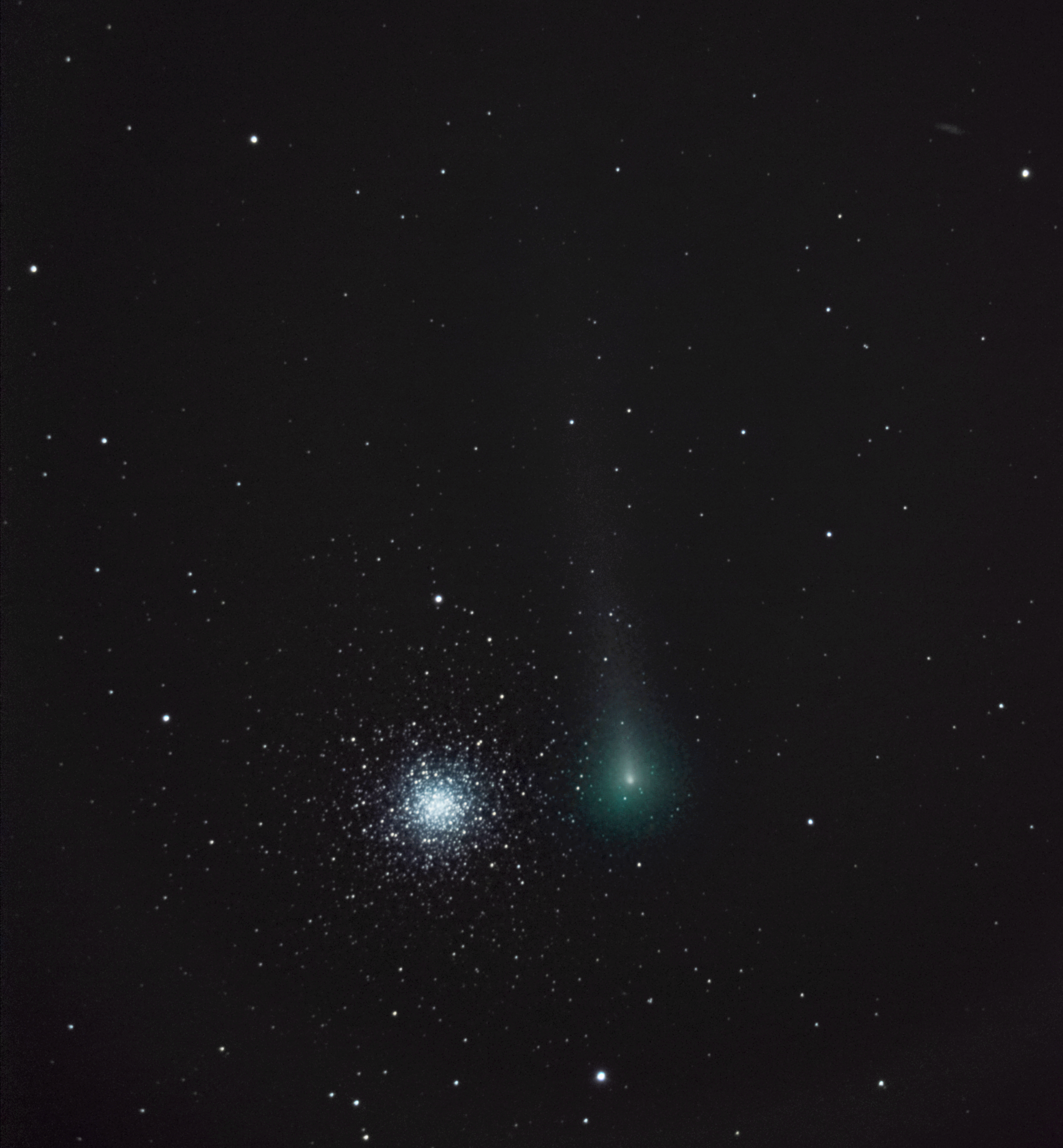 Komet C/2021 A1 Leonard zog in den Morgenstunden des 3. Dezember 2021 am Kugelsternhaufen M3 vorbei, hier aufgenommen vom Stadtbalkon bei eisigem Wind. Es war die einzige wirklich klare Nacht in den vergangenen Wochen, da hat sich das frühe Aufstehen gelohnt.