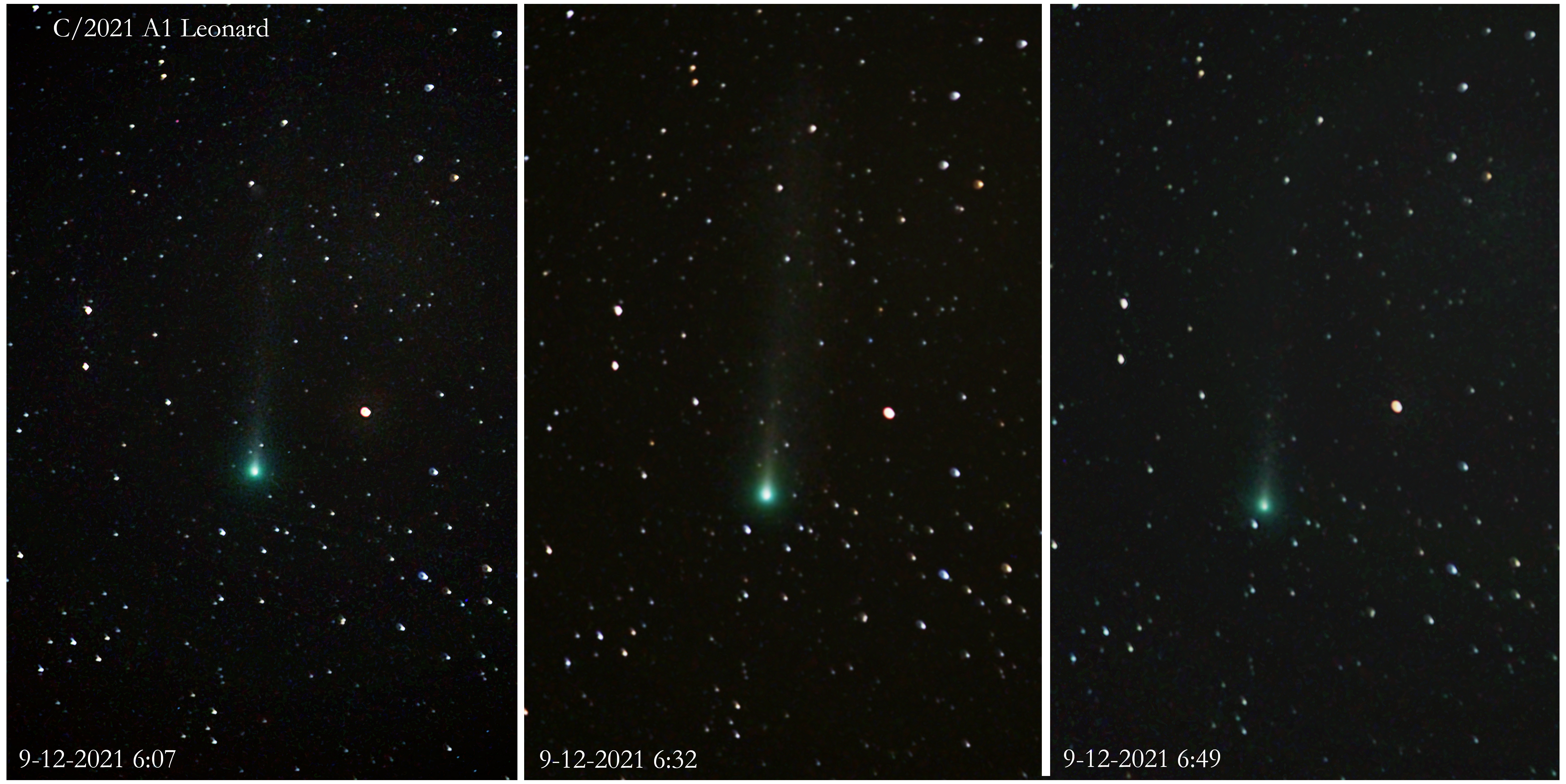 Endlich, nach einigen ergebnislosen Nächten, ein klarer Morgenhimmel, und ich konnte diesen Kometen fotografieren. Diese Bilder zeigen ganz klar die Bewegung des Kometen relativ zu den Sternen.