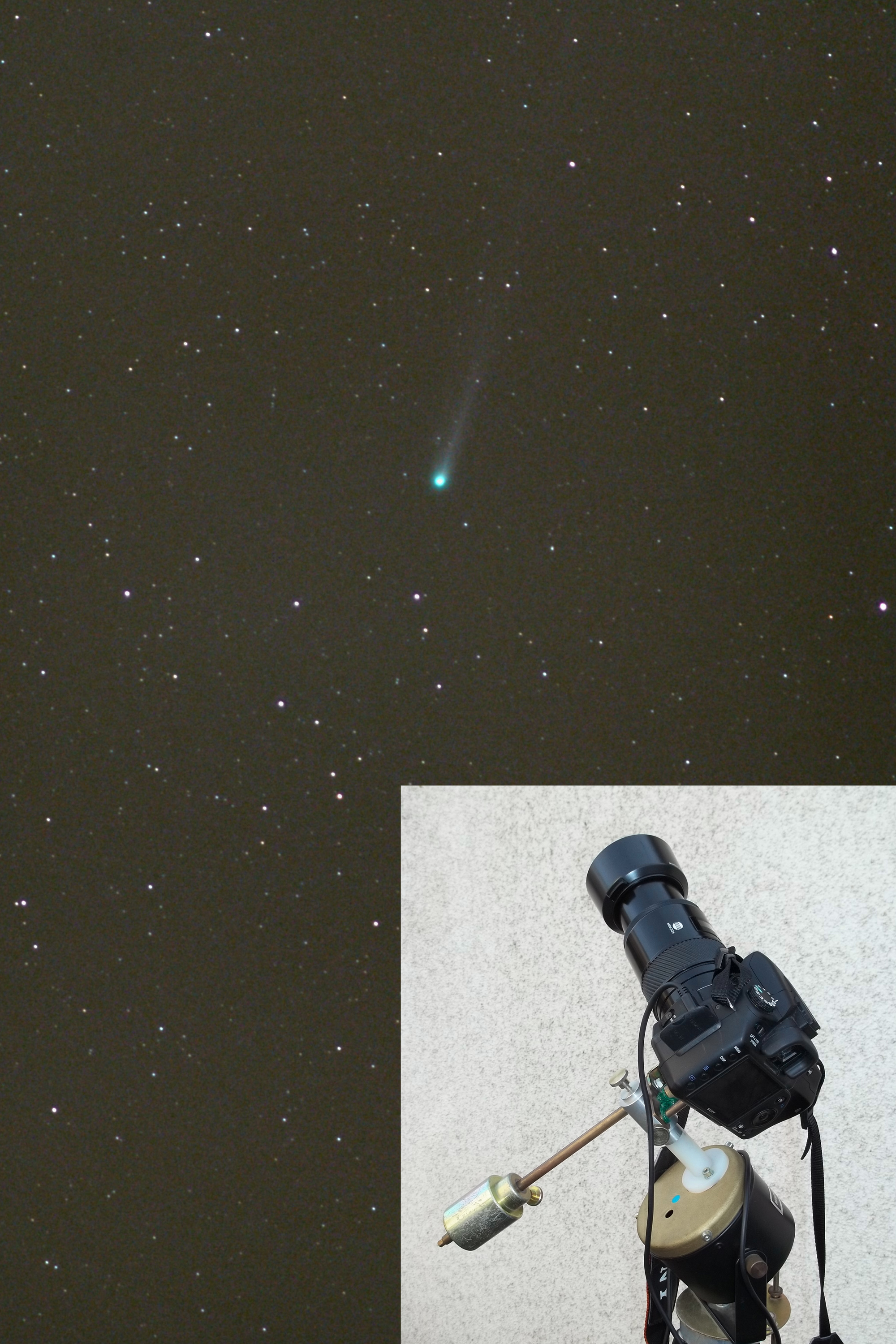 Angespornt durch die Berichte über den nahenden Kometen ISON habe ich meine seit dem Kometen Hale-Bopp 1997 unbenutzte mechanische Uhrwerksnachführung (PURUS-Astromechanik) wieder ausgegraben. Nachdem der erhoffte Jahrhundert-Komet ausblieb, konnte ich immerhin den Kometen Lovejoy am 13.12.2013 zwischen 6:28 und 6:33 Uhr MEZ mit meiner Digitalkamera und 200-mm-Objektiv ablichten (Bild kombiniert aus drei Einzelfotos). Von dem Ergebnis unter sehr schlechten Bedingungen bei drastischer Lichtverschmutzung in Leverkusen-Opladen war ich selbst überrascht.