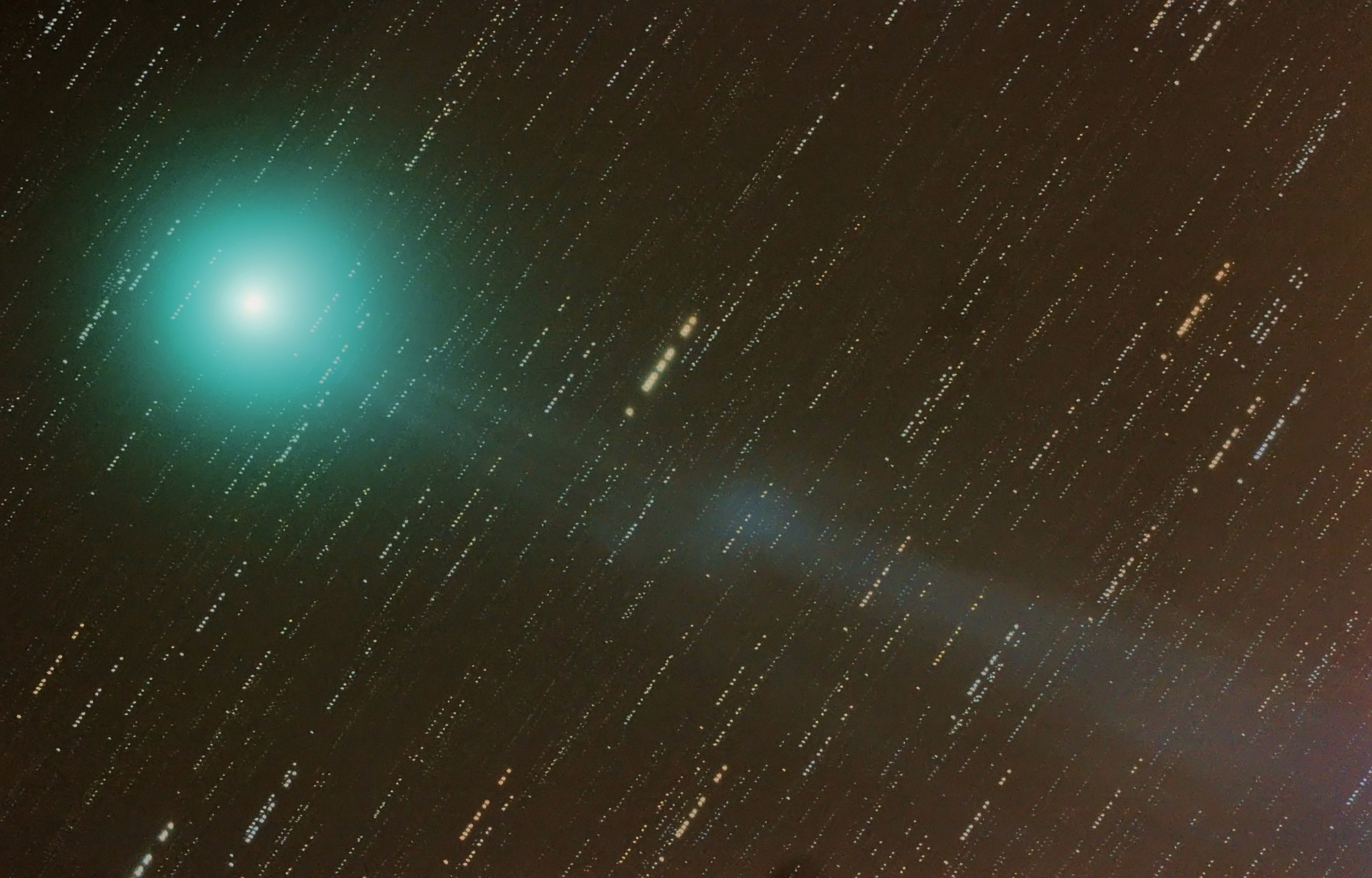 Am 8. Januar klarte es kurzfristig auf. Da es obendrein recht windig war, habe ich mich mit transportablem Gerät in eine geschützte Ecke gestellt. Zwölf Aufnahmen des Kometen à zwei Minuten wurden hier überlagert.