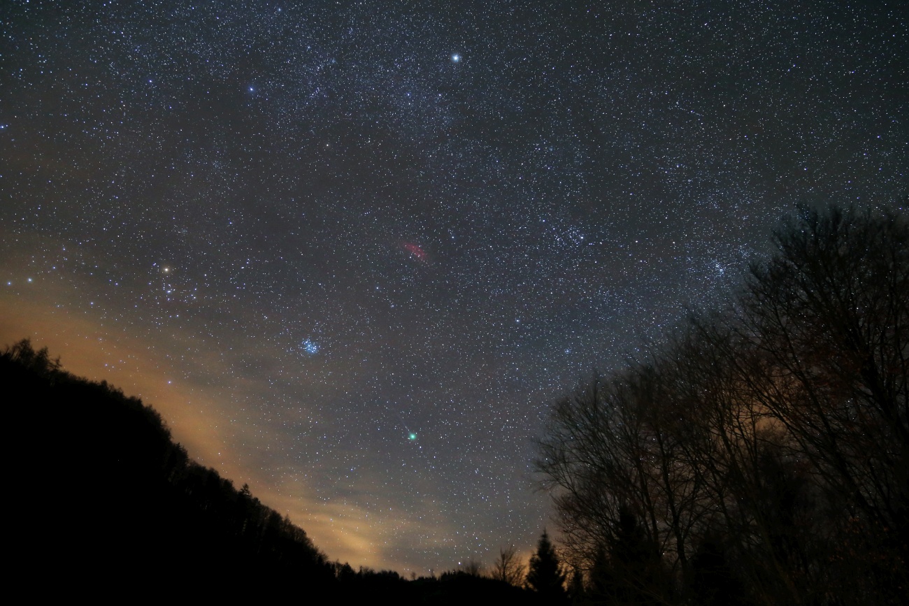 Widefield Aufnahme Komet Lovejoy mit den markanten Objekten Plejaden, Hyaden, Californianebel und oben im Bild der helle Stern Kapella. http://www.astromethyst.at