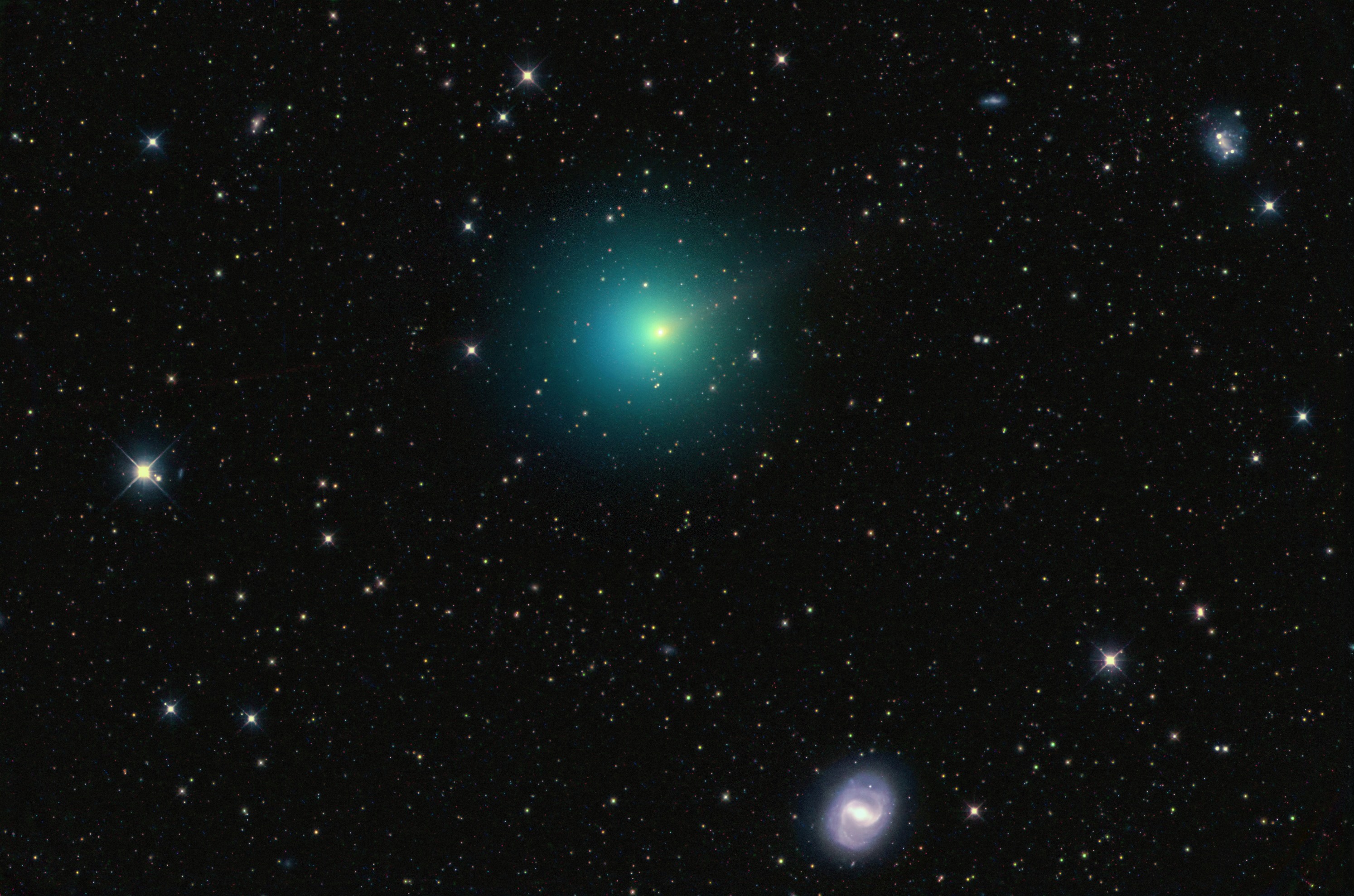 Der 9 mag helle Komet 24P/Schaumasse zog im Dezember an zahlreichen Galaxien in der Jungfrau vorbei. An diesem Abend stand er nahe Messier 91.