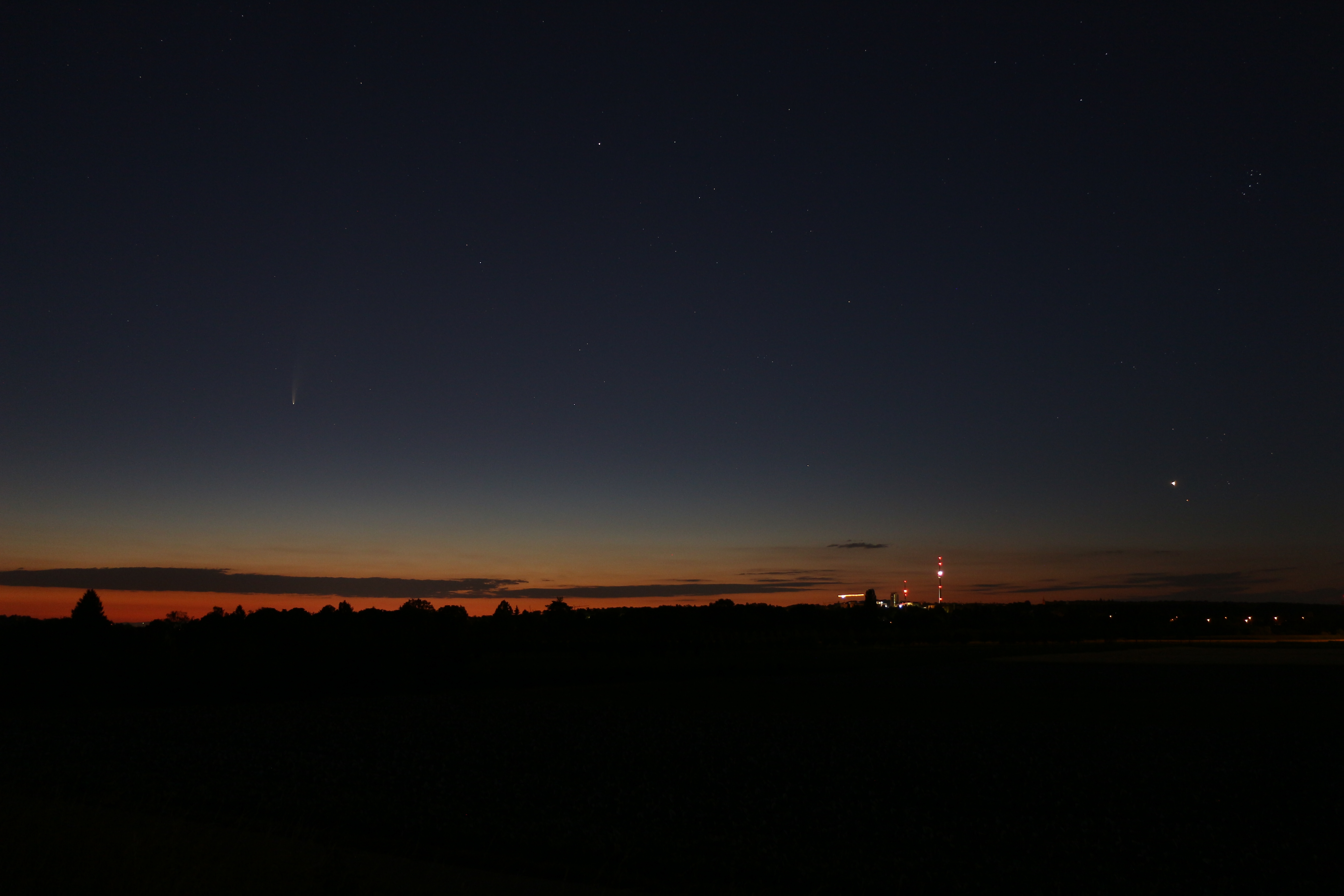 Komet Neowise am Morgen des 10. Juli 2020 mit Venus und Stuttgarter Fernsehturm.