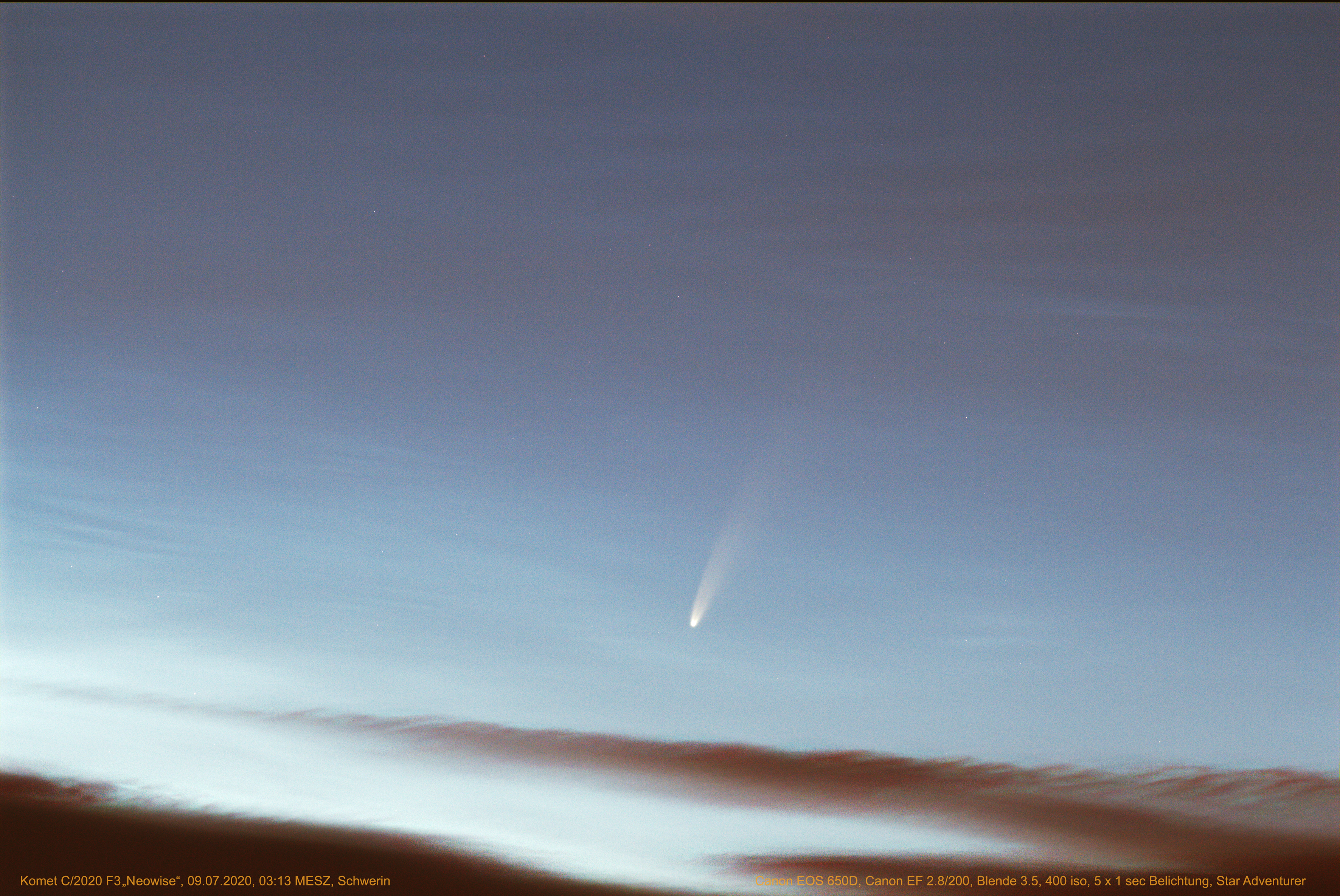 Ich konnte am 9. Juli 2020 eine Wolkenlücke für Aufnahmen des Kometen nutzen. Leider war es hier in Norddeutschland gegen 3:00 Uhr schon ziemlich hell.