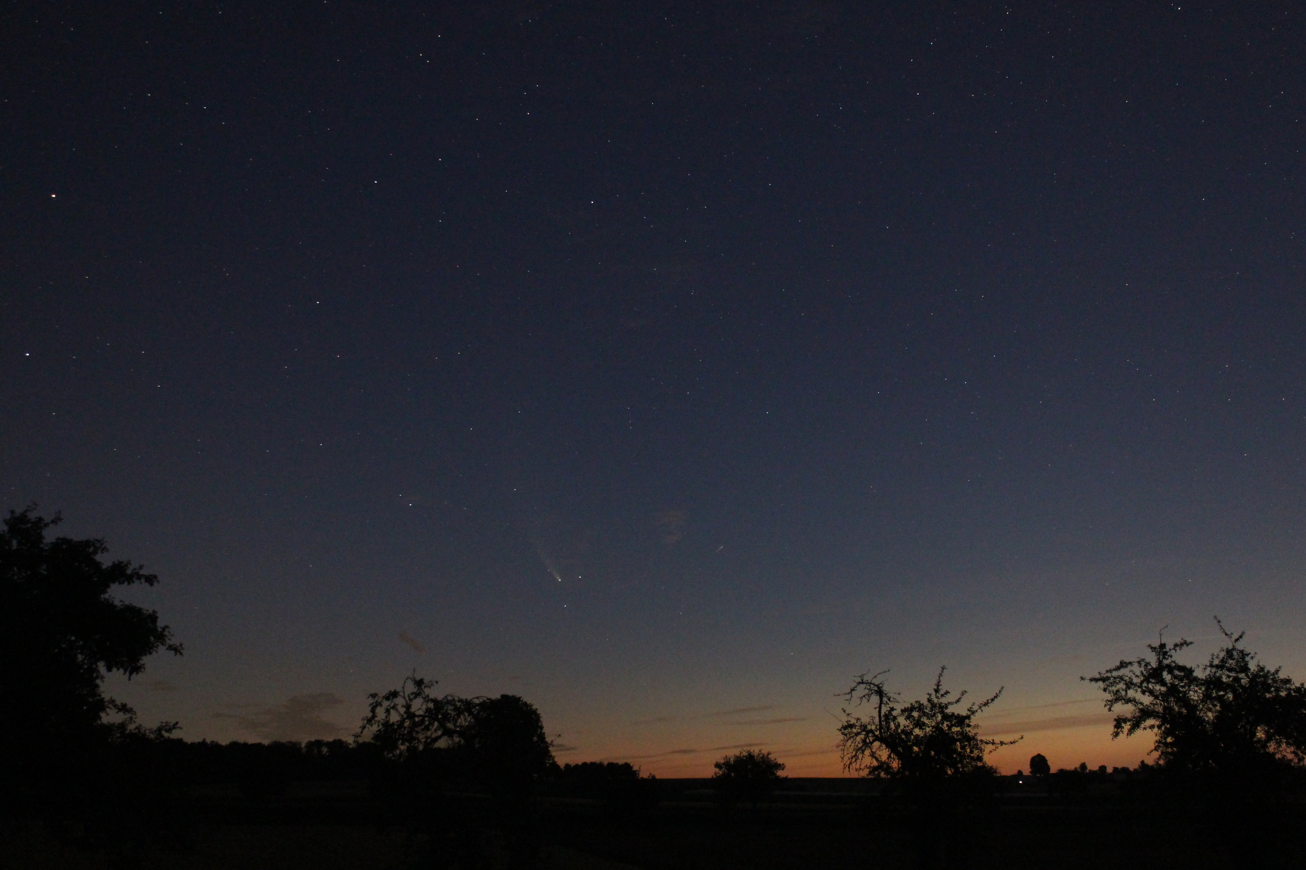 Komet Neowise F3 in der vorderen Tatze des Großen Bären, aufgenommen in der beginnenden Morgendämmerung auf einer Wiese zwischen dem Sindelfinger Ortsteil Maichingen und dem Grafenauer Ortsteil Döffingen.