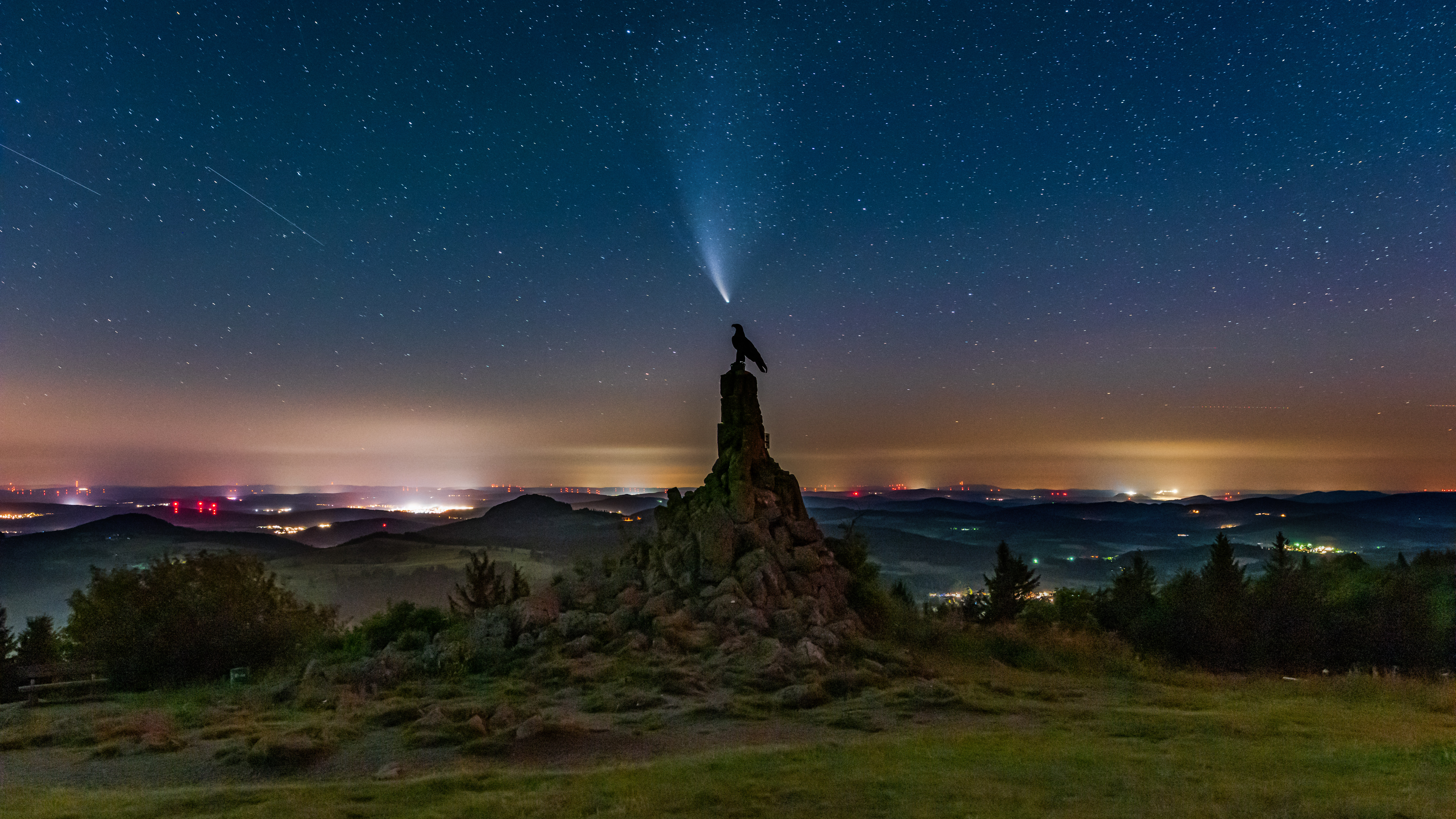 Komet Neowise über dem Fliegerdenkmal der Wasserkuppe.