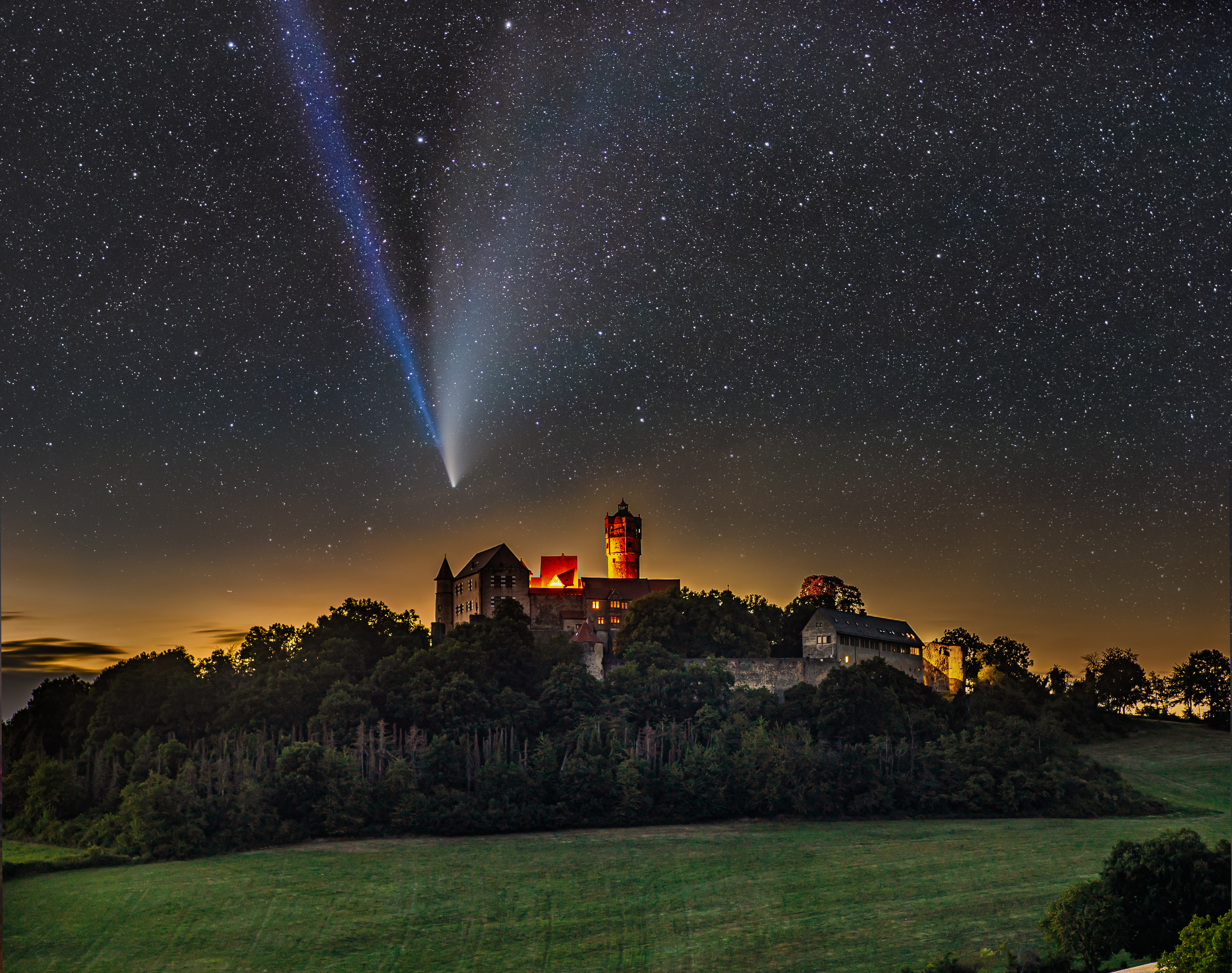 Leserbilder Astronomie: Komet Neowise über Ronneburg – Komposit