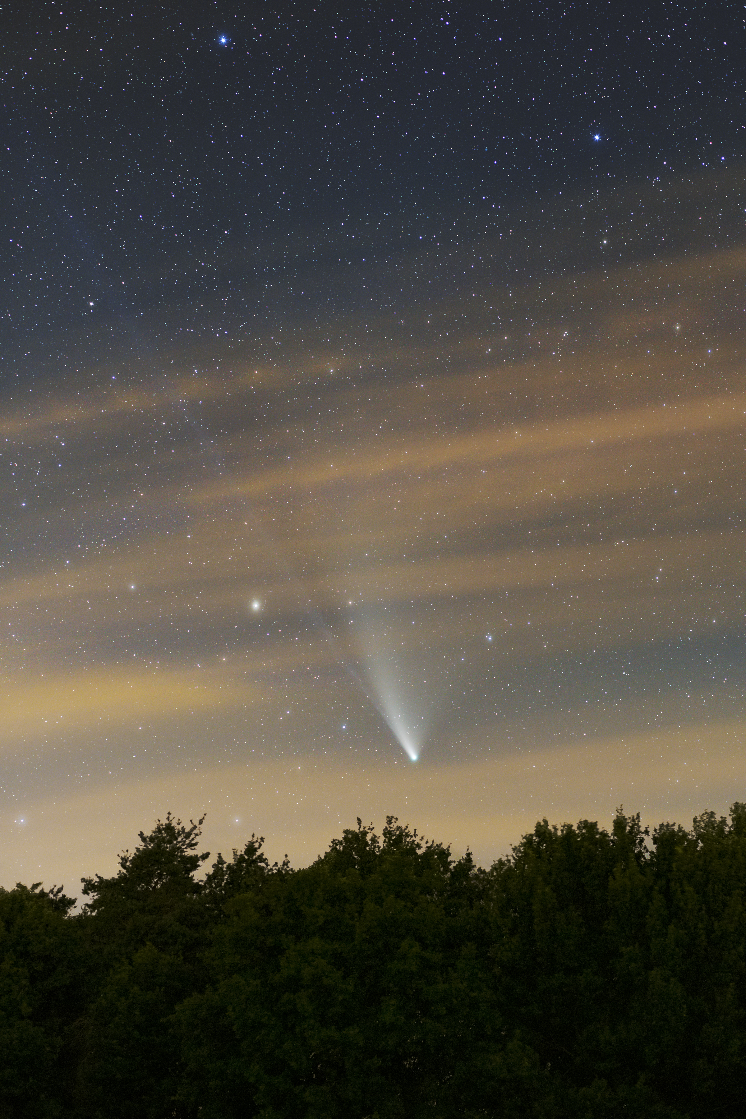 In der Nacht seiner größten Erdannäherung war der Komet kurz vor Mitternacht, dicht am Waldrand, ein leichtes Objekt für das freie Auge. F3 (NEOWISE) stand gut auffindbar unter dem Großen Wagen dessen Sterne Beta und Gamma UMa noch ins (obere) Bildfeld passten. Leider zogen am Nordhorizont beständig Cirruswolken durch, so dass der breit gefächerte, weiß wirkende Staubschweif und der schmale, bläuliche Ionenschweif nicht in voller Pracht abzubilden waren. Dennoch ein grandioses Naturschauspiel.