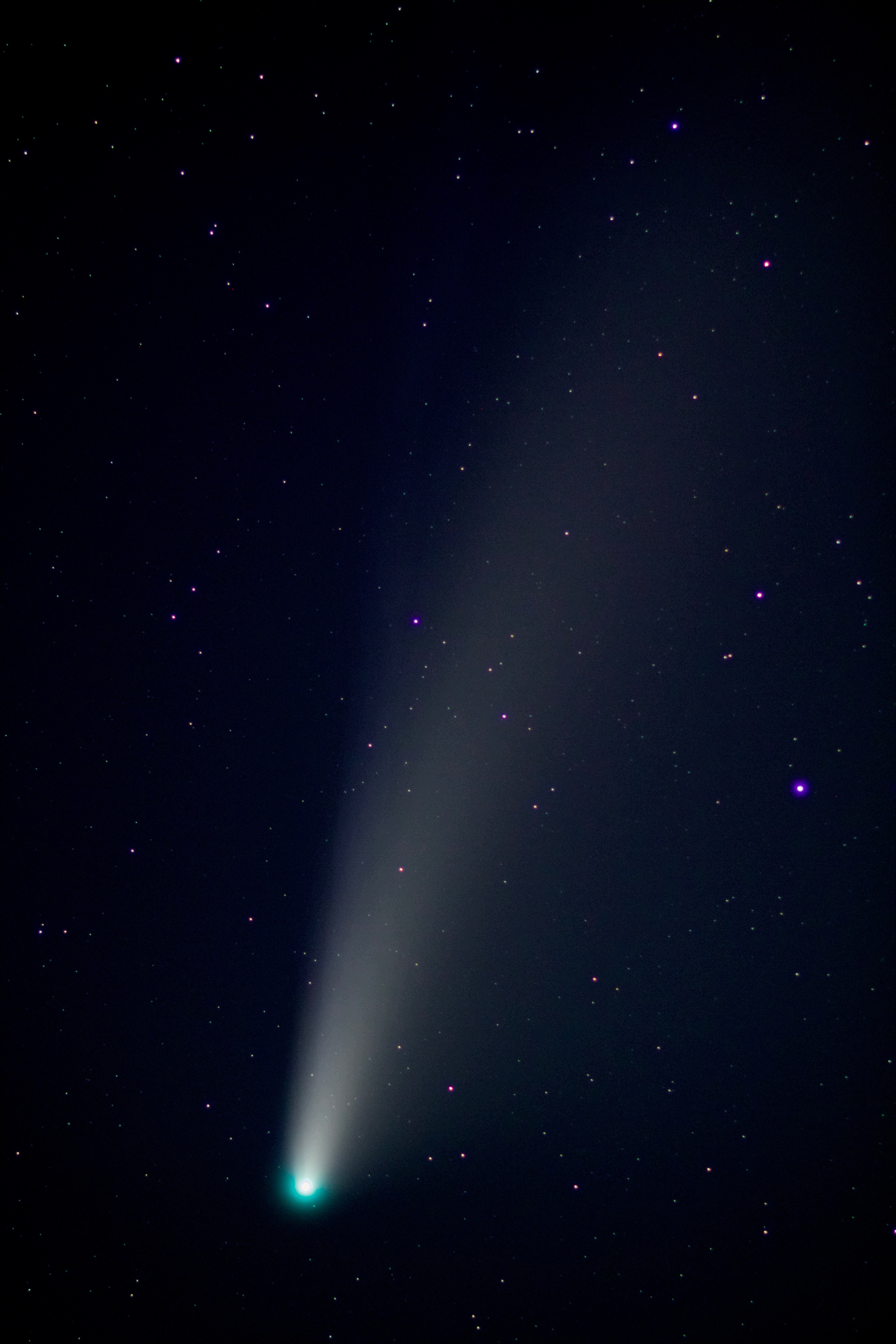 Am 20. Juli 2020 konnte ich die grüne Koma des Kometen Neowise am 12-Zoll-Dobson beobachten; so viel Farbe hatte ich noch nie mit eigenen Augen an einem Kometen oder anderem nebelartigen Objekt gesehen. Bisher kenne ich kein anderes Bild, das die farbige Koma zeigt, was mich doch etwas wundert. Das Bild entstand kurz danach aus drei Lightframes an einem Besser 102/460 XS mit einer Canon 70D.