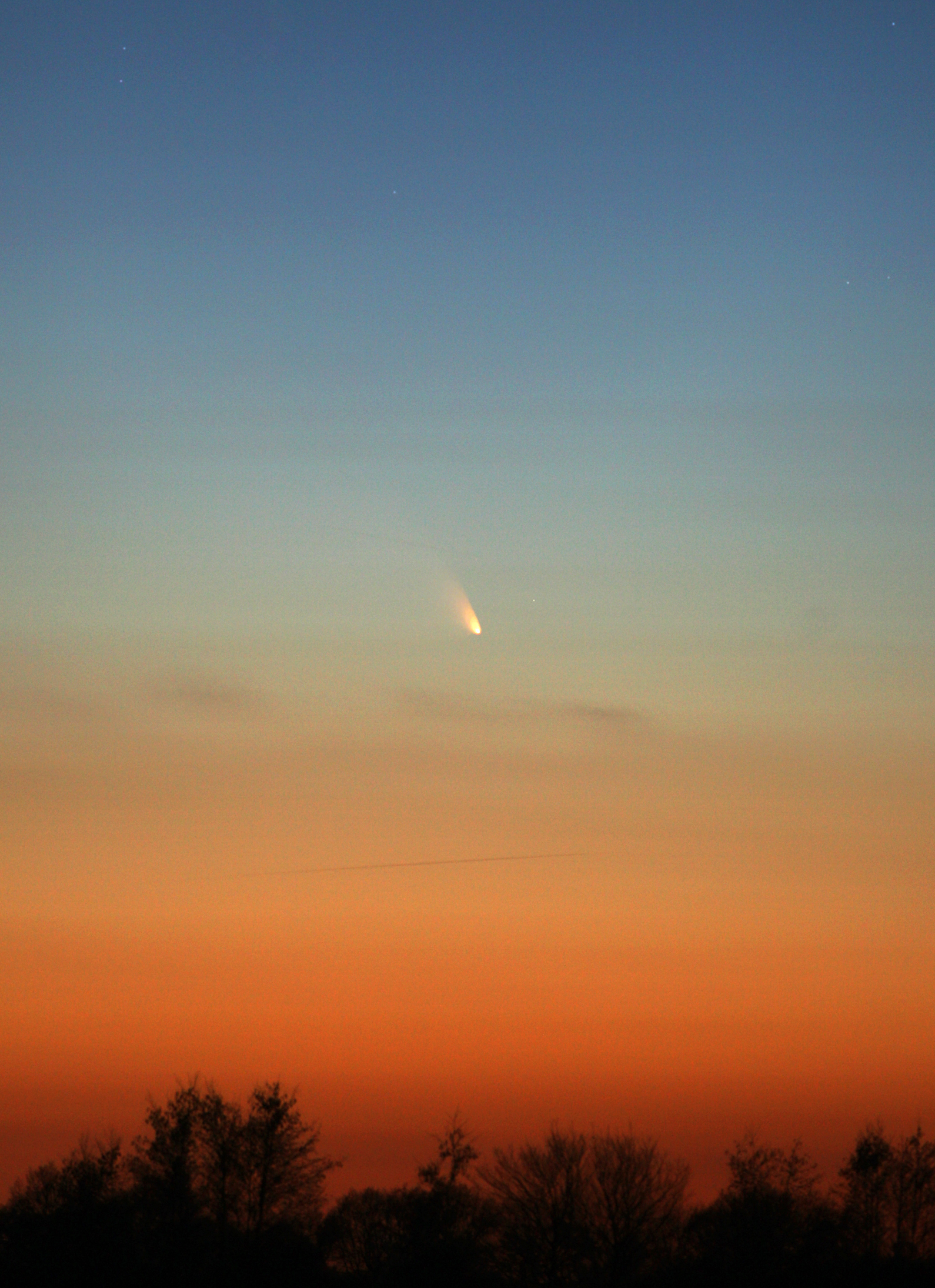 Eigentlich sollte es an dem Abend des 14. März 2013 nicht aufklaren. Als ich aber gegen Abend aus dem Fenster schaute, stellte ich fest, dass der Mond sehr gut zu sehen war. Also ging es mit dem Auto schnell ins Nahe Münsterland, wo ich meine kleine Ausrüstung aufbaute. Mit dem Feldstecher konnte ich den Kometen schnell ausmachen und sofort löste ich die Kamera aus. In der Stille der schönen Landschaft war es für mich ein beeindruckendes Erlebnis, obwohl der Komet so schwach war.