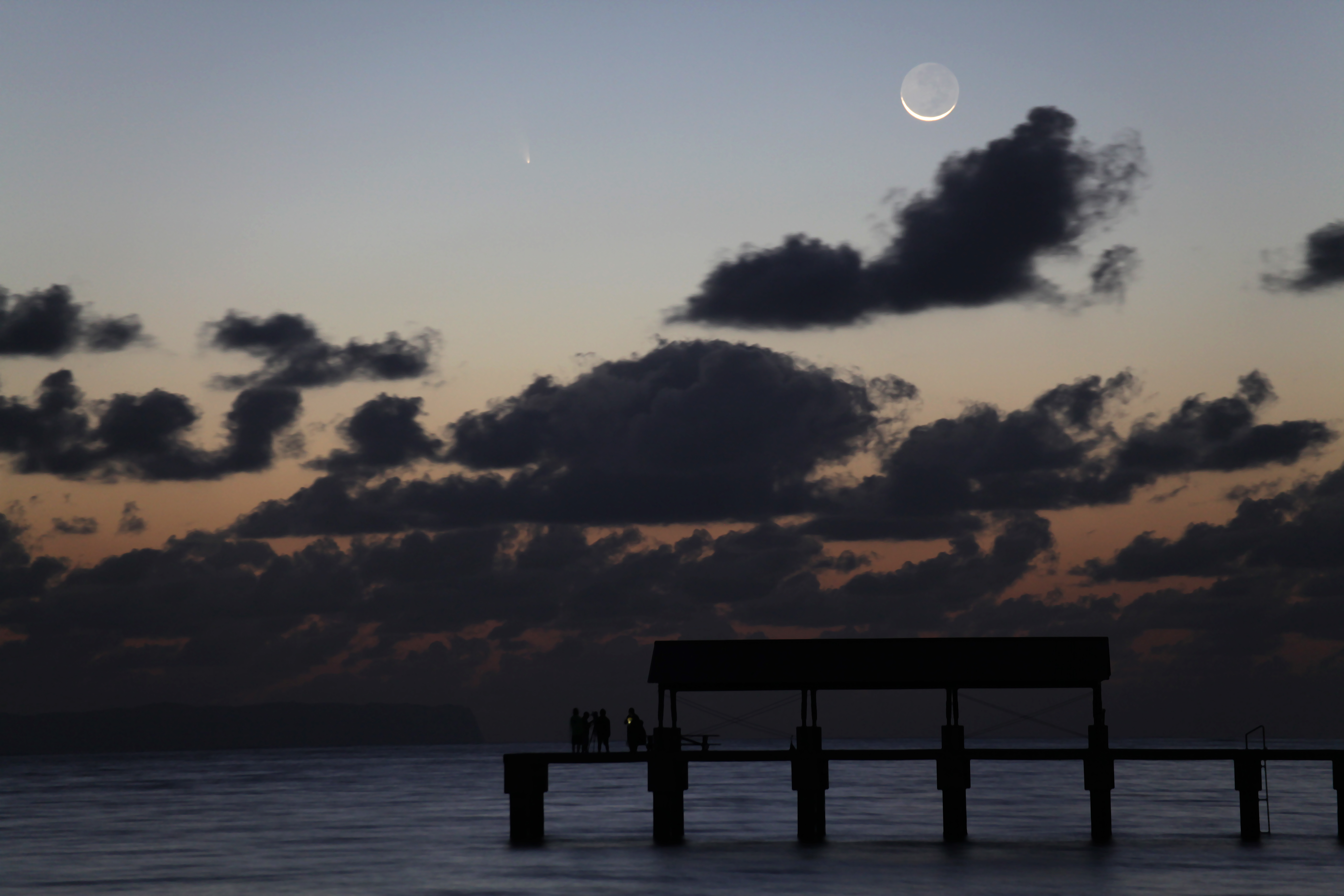 Auf der Hawaii-Insel Kauai konnte ich den Kometen PANSTARRS mit dem Mond ablichten. Ein nahe gelegener Steg und die Wolken verliehen eine besondere Stimmung. Der Komet war mit bloßem Auge gerade zu sehen.