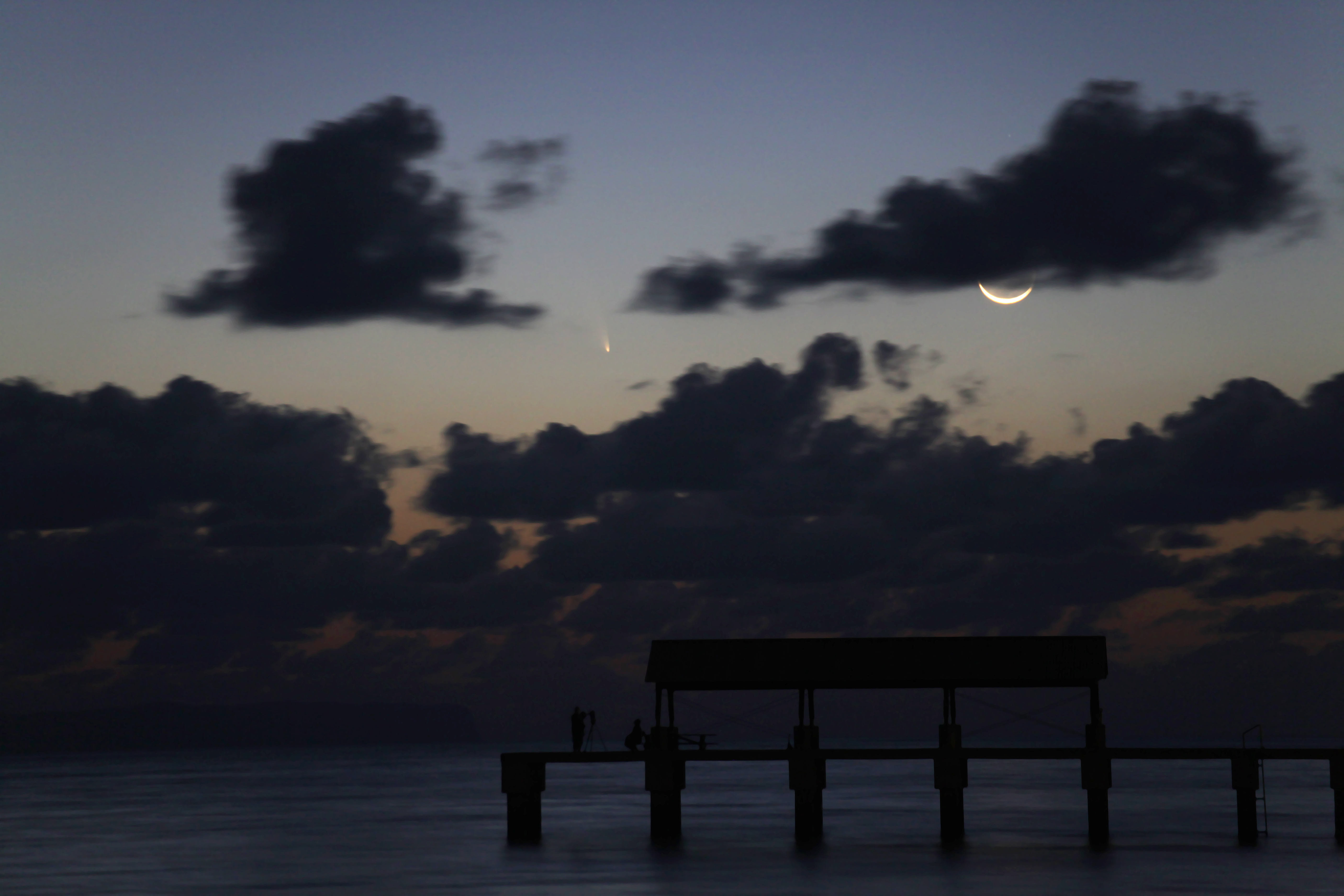 Auf der Hawaii-Insel Kauai konnte ich den Kometen PANSTARRS mit dem Mond ablichten. Ein nahe gelegener Steg und die Wolken verliehen eine besondere Stimmung. Der Komet war mit bloßem Auge gerade zu sehen.