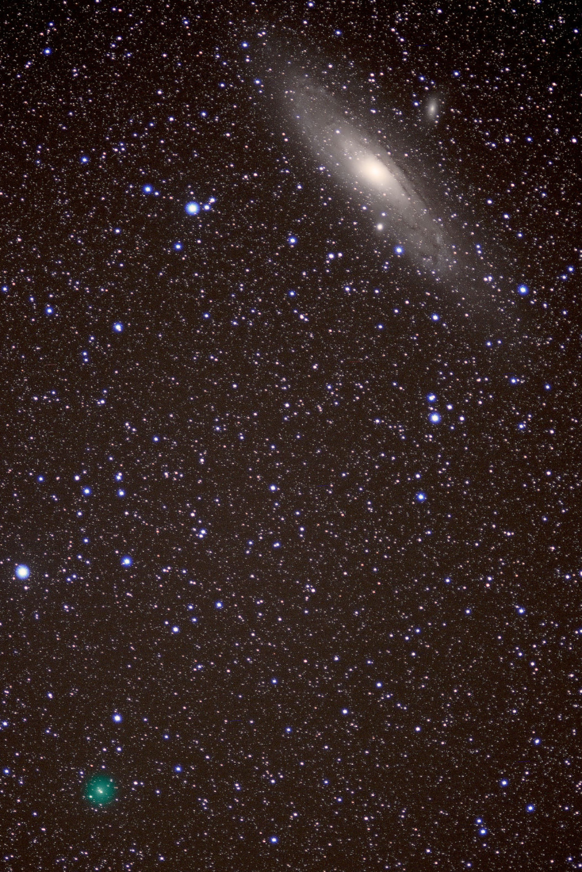 Nach Giacobini-Zinner und Stephan-Oterma eignet sich für mich ein weiterer Komet als Einstieg in die Kometenfotografie. Hoch am Abendhimmel im Sternbild Andromeda zieht gerade 64P/Swift-Gehrels an M 31 vorbei. Erstaunlich, was man mit einer handelsüblichen DSLR und einem 135-mm-Objektiv schon erreichen kann. Der Komet verrät sich durch seine türkis- grünliche Farbe.