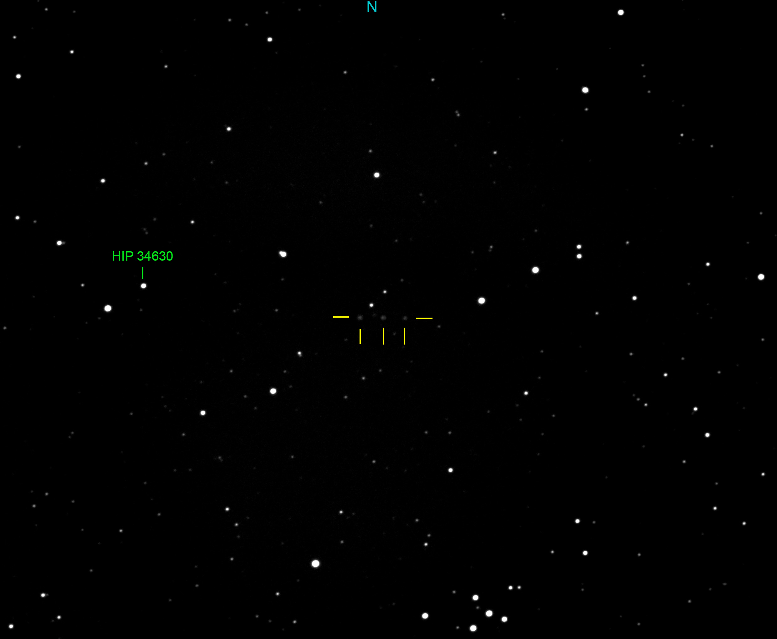 Komet 67P/Tschurjumow-Gerasimenko alias Tschuri durchquert das Sternbild Zwillinge. Überlagerung von mehreren Aufnahmen vom 23. August 2015 mit drei Kometenpositionen (Bildmitte) im zeitlichen Abstand von etwa 20 Minuten: rechts: ca 02:27 Uhr (UT), Mitte 02:47 Uhr, links 03:08 Uhr. Bildausschnitt etwa 25 x 25 Bogenminuten.