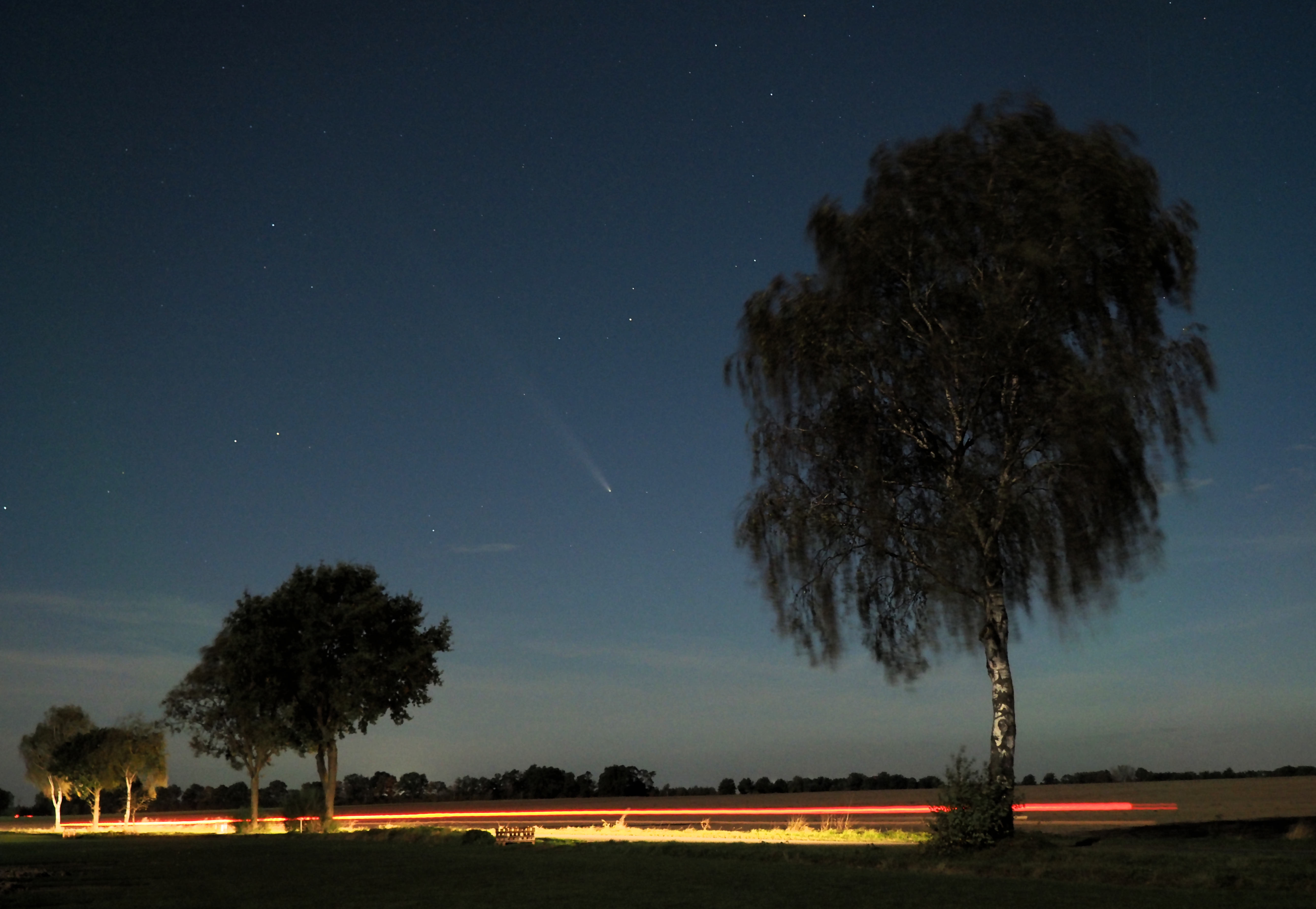 Das Wetter hatte mitgespielt: Am 13. Oktober noch nicht so ganz, da ließen horizontnahe Wolkenschleier durch ein kleine Wolkenlücke nur den Kopf des Kometen erkennen. Am 15. Oktober war es dann fast perfekt, und noch ein wenig klarer am 16. (siehe Foto). Visuell zwar nur äußerst schwach wahrnehmbar, zeigt das Foto den sehr langen Schweif, weitaus länger als beim vorigen mit bloßem Auge sichtbaren Kometen Neowise im Sommer 2020. Die Luft war so klar, dass auch das starke Mondlicht - einen Tag vor Vollmond - den Eindruck nicht schmälern konnte, zumal der Beobachtungsort nicht vom Licht der nächsten Ortschaften gestört wurde.